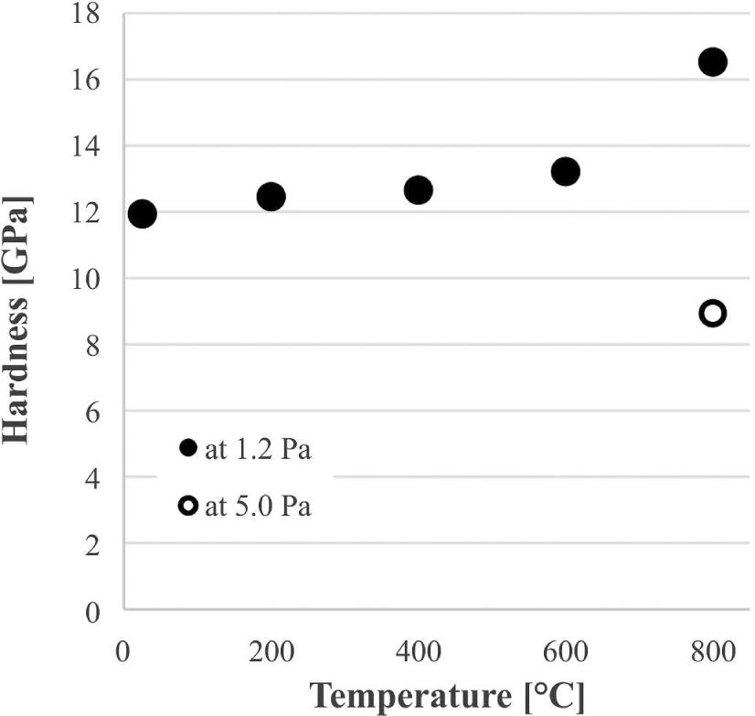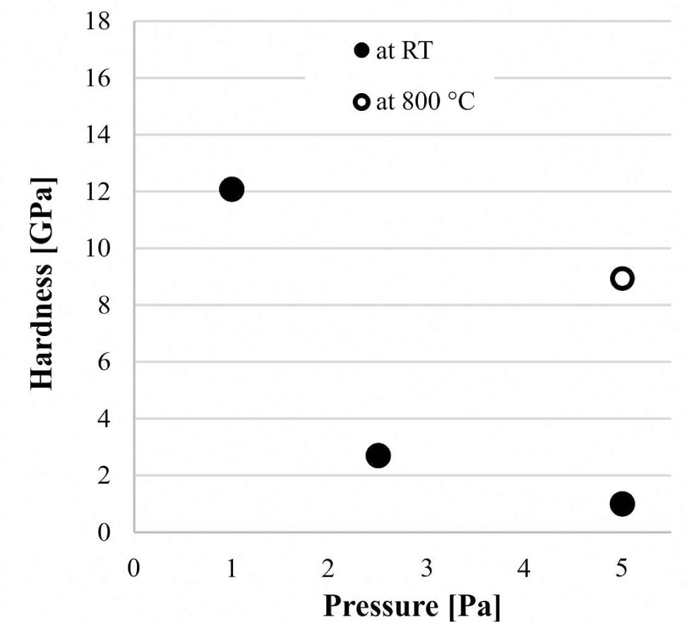 The results of the hardness and Young’s modulus investigations are shown in Fig. 9 and Fig. 10, respectively. The samples obtained at 25 Pa were too thin and too uneven to be measured. The findings shown in Fig. 9 indicate that the hardness drastically diminished from 12 GPa to about 1 GPa, when the pressure was increased from 1.0 Pa to 5 Pa. A similar dependence can be observed for the Young’s modulus (Fig. 10). The values obtained are in the range of 35 GPa to 70 GPa, 80 GPa to 130 GPa, and 177 GPa for pressures of 1 Pa, 2.5 Pa and 5 Pa, respectively. It can also be observed that the mechanical properties can be improved by increasing the temperature (Fig. 9).