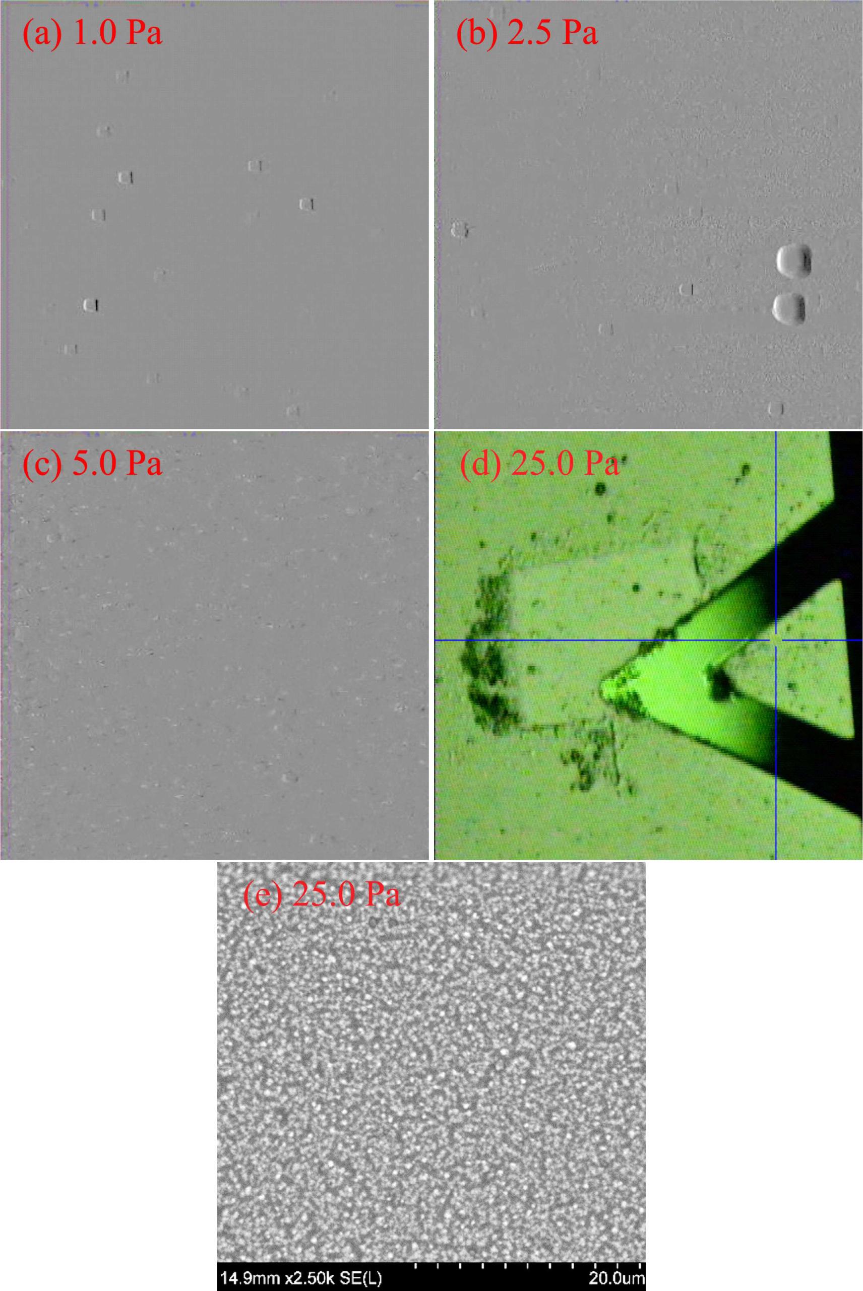 Surface topography (20 μm × 20 μm) of coatings obtained at various deposition pressures; (a) to (c) is AFM; (d) is optical microscopy, and (e) is SEM.