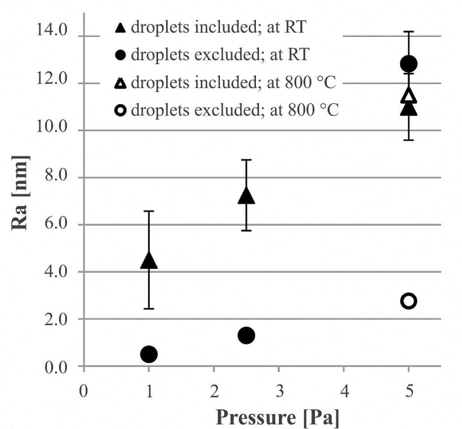 The film deposition took place at an oxygen-to-nitrogen ratio of 4:6 in the background gas which was selected based on the previous studies [17]. Two series of experiments were carried out: one with pressure varied from 1.0 Pa to 25 Pa at room temperature (RT) and the other one with temperature varied from 20 °C to 800 °C at 1.2 Pa. Moreover, an additional process was carried out at 800 °C and 5 Pa in order to investigate how both parameters influence each other. The deposition time corresponded to 30 000 pulses of laser with a repetition rate of 10 Hz, corresponding to 50 min.