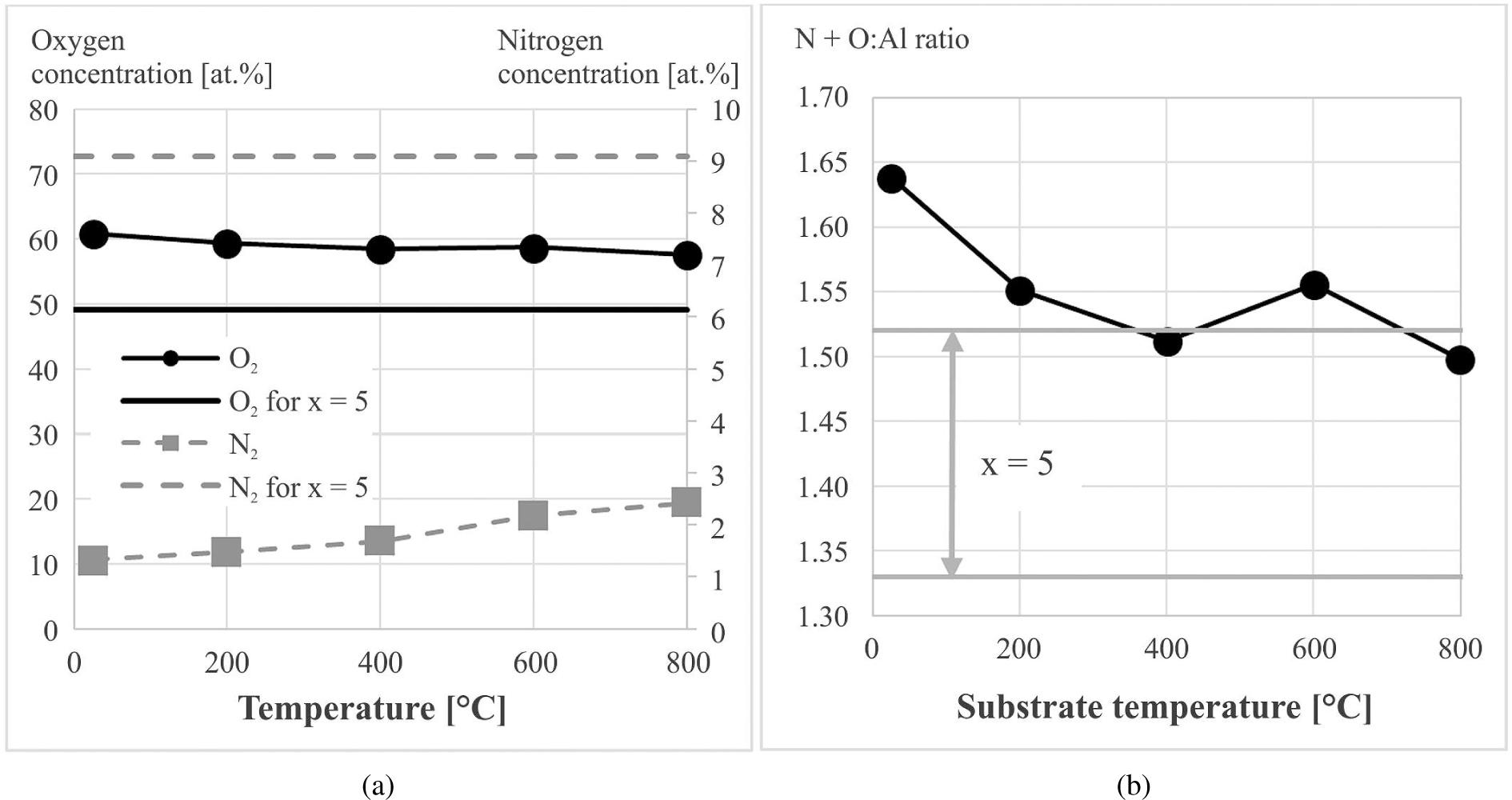 Oxygen and nitrogen concentrations (a) and N + O:Al ratio (b) in coatings obtained at different temperatures; EDS and WDS.