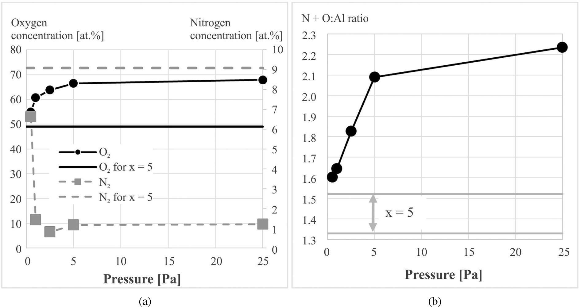 Oxygen and nitrogen concentration (a), and N + O:Al ratio (b) in coatings obtained at different pressures; EDS and WDS.