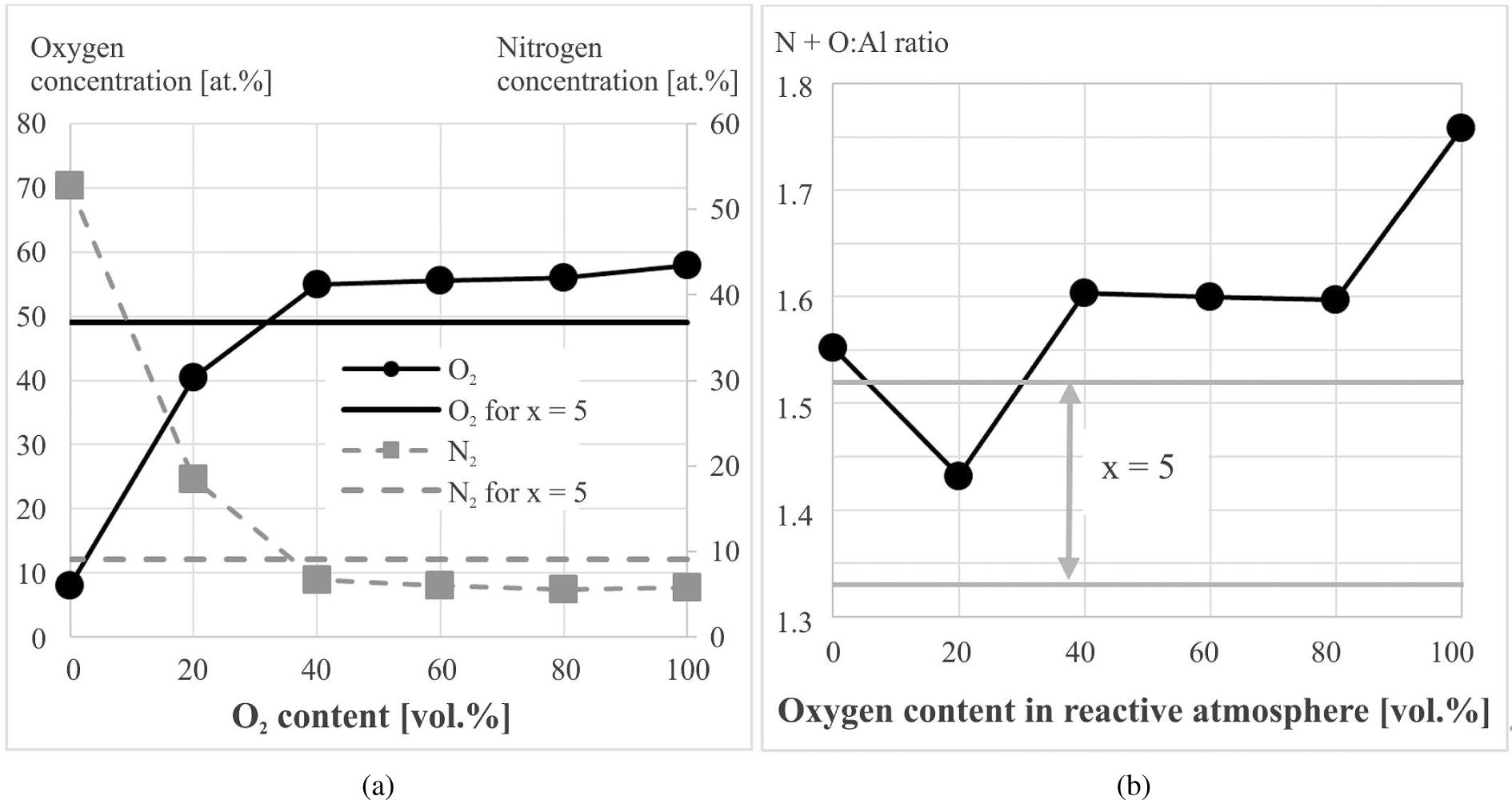 Oxygen and nitrogen concentration (a), and N + O:Al ratio (b) in coatings obtained at different atmosphere compositions (based on the results presented in the literature [17]); EDS and WDS.