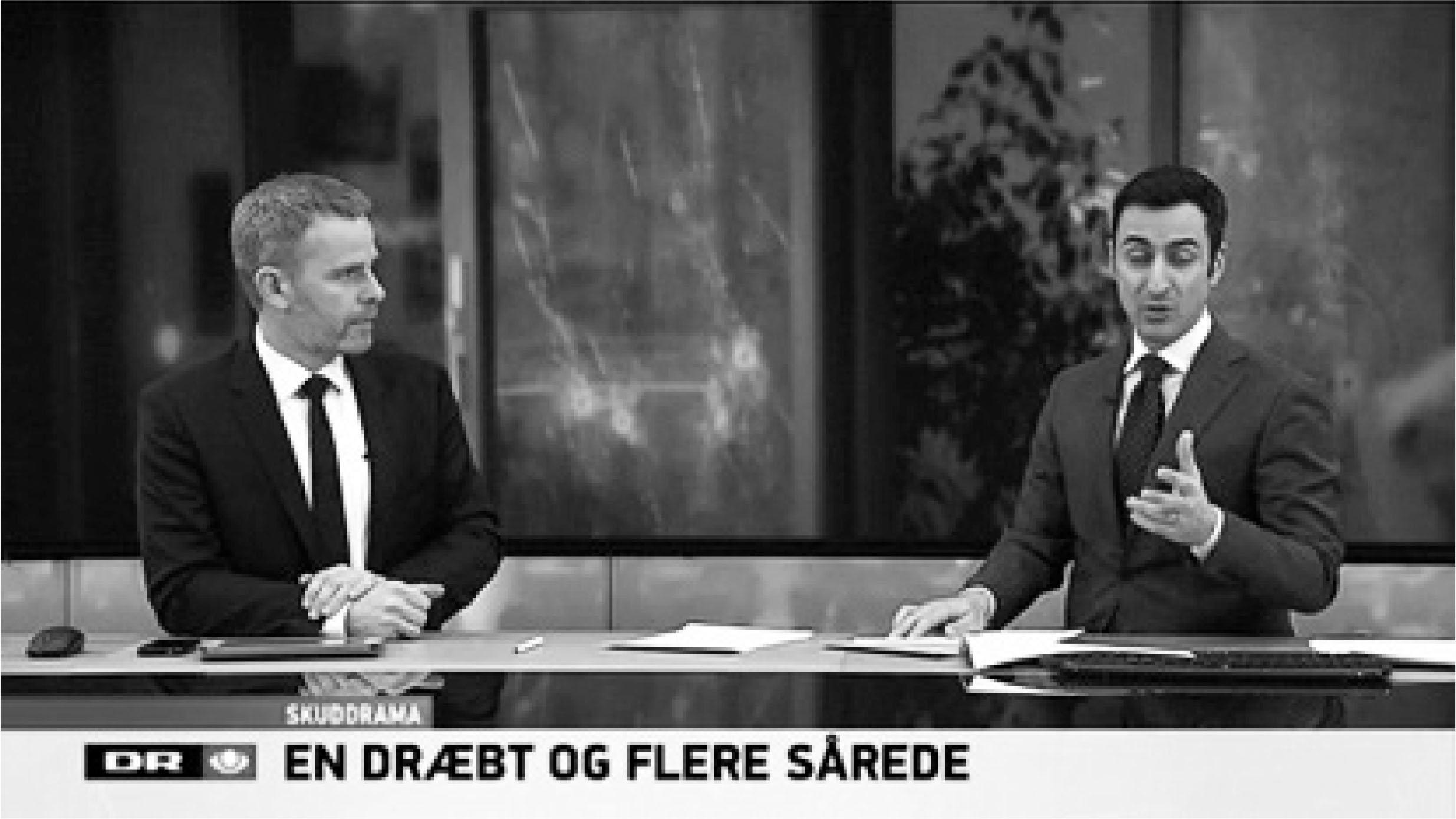 The newscast on Saturday is broadcast in the regular scheduled time slot, but it reports solely on the shooting. On the screen is a bar with the headline “Shooting drama” and below that “One killed in Østerbro” – later this is changed to “One killed and several injured”. In the studio are two people, the news anchor and DR1's crime reporter, who plays a role as both co-anchor and expert on the subject. During the newscast, the anchor is in dialogue with a number of journalists dispatched to different locations in Copenhagen. Two reporters are in place near the scene of the shooting while a third is located in the northern part of the same neighbourhood where the police have found the getaway car. Another reporter is at the police headquarters. There are also interviews with eyewitnesses who happened to be in the vicinity at the time of the shooting.