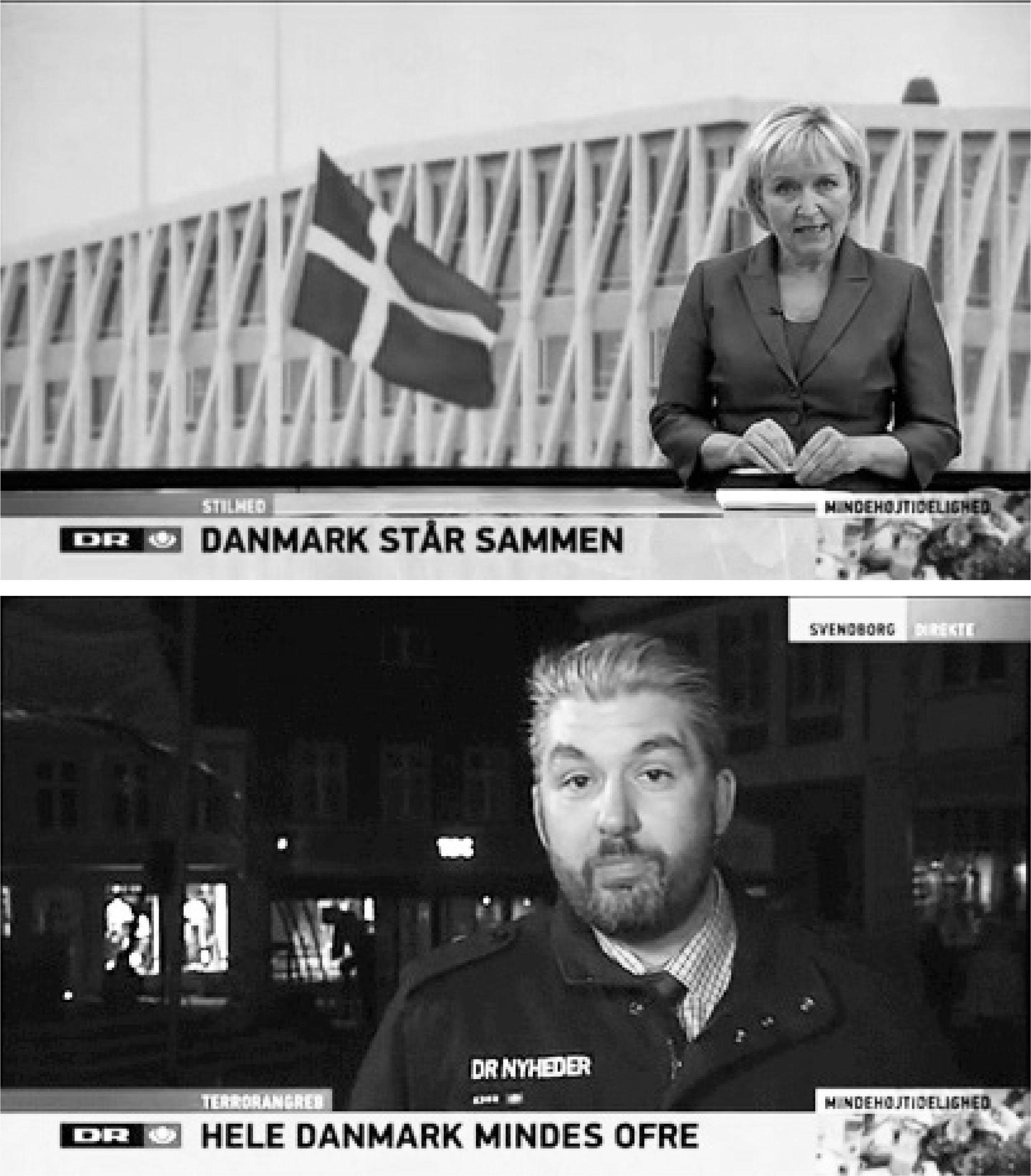 In accordance with the terror framing, moral judgement is clear and undisputed. The prime minister and leading politicians are all eager to condemn the attack and the anti-democratic forces behind it, and they condemn it in the name of the whole nation. This framing is repeated when reports are made from the memorial sites that have emerged. Journalists act as masters of a mourning ceremony when they broadcast live and continuously, for instance, from the synagogue where both politicians and citizens have placed candles and flowers “in respect for the victims”, as it is explained. Everyone is questioned about their feelings – pre-defined as fear, grief or solidarity. A participant in the commemoration in Aarhus tells the reporter: “It could just as well have happened here or anywhere in Denmark” (DR1 16/02/2015). The picture frame emphasises the unity with words like “Denmark stands united” or “All of Denmark commemorates the victims” (ibid.). The media participation in giving voice to the grief and fear reaches its climax Monday evening, when the scheduled programmes on DR1 are cancelled for the benefit of the commemoration held close to Krudttønden with the participation of prominent ministers and politicians as well as Crown Prince Frederik. DR1 has several reporters present, just as Danmarks Radio co-organises the ceremony in collaboration with an alliance of political parties in Copenhagen.