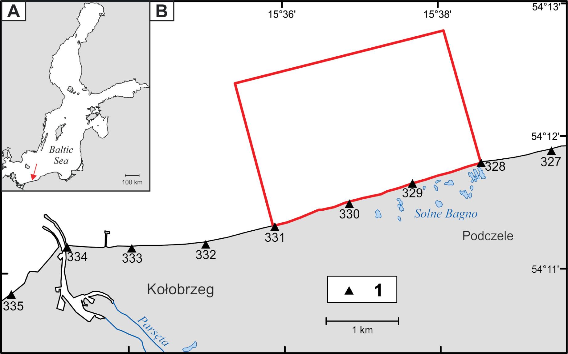 The study area is the nearshore seabed lying at the depth of up to 12 meters. It is located between 328 and 331 km of the Polish shoreline (Fig. 1), according to the mileage (expressed in kilometers) of the Maritime Offices in Poland. It is situated to the east of the Port of Kołobrzeg, between the beaches of Kołobrzeg and Podczele.
