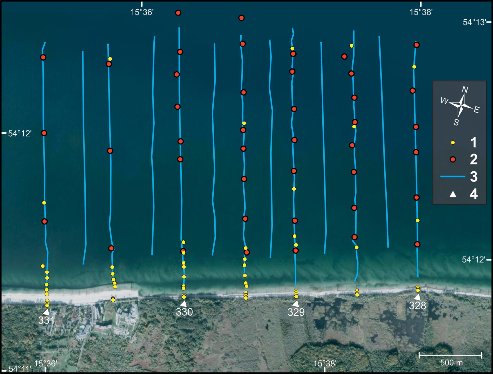 Location map of: 1 – grab sediment samples, 2 – core samples, 3 – sub-bottom profiles, 4 – kilometers of the Polish shoreline. Orthophotomap (by CODGiK, October 19, 2012) in the background