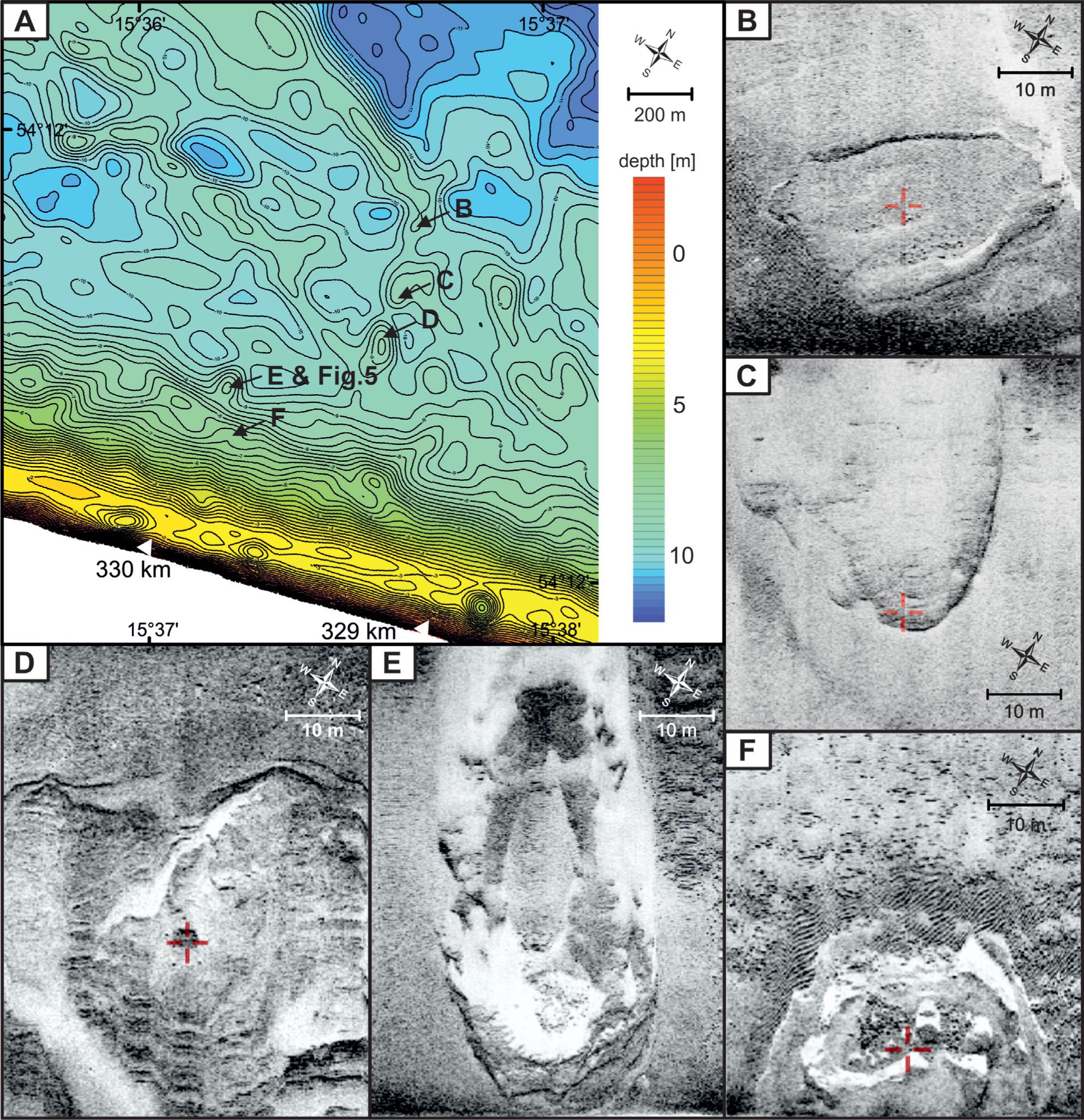 According to the previous studies related to the region (Dobracka 1987, 1988; Dobracki & Przezdziecki 2007; Kramarska et al. 1999), the rocks were recognized as outcrops of Jurassic sandstones and mudstones. They are of varying shapes and sizes, ranging from 20 to 50 m. The outcrops are up to 1.5 high relative to the surrounded seafloor. Their relief and structure indicate significant tectonic deformations. Many folds and faults of these layers are visible (D in Fig. 4). The surface of the outcrops is covered by shells.