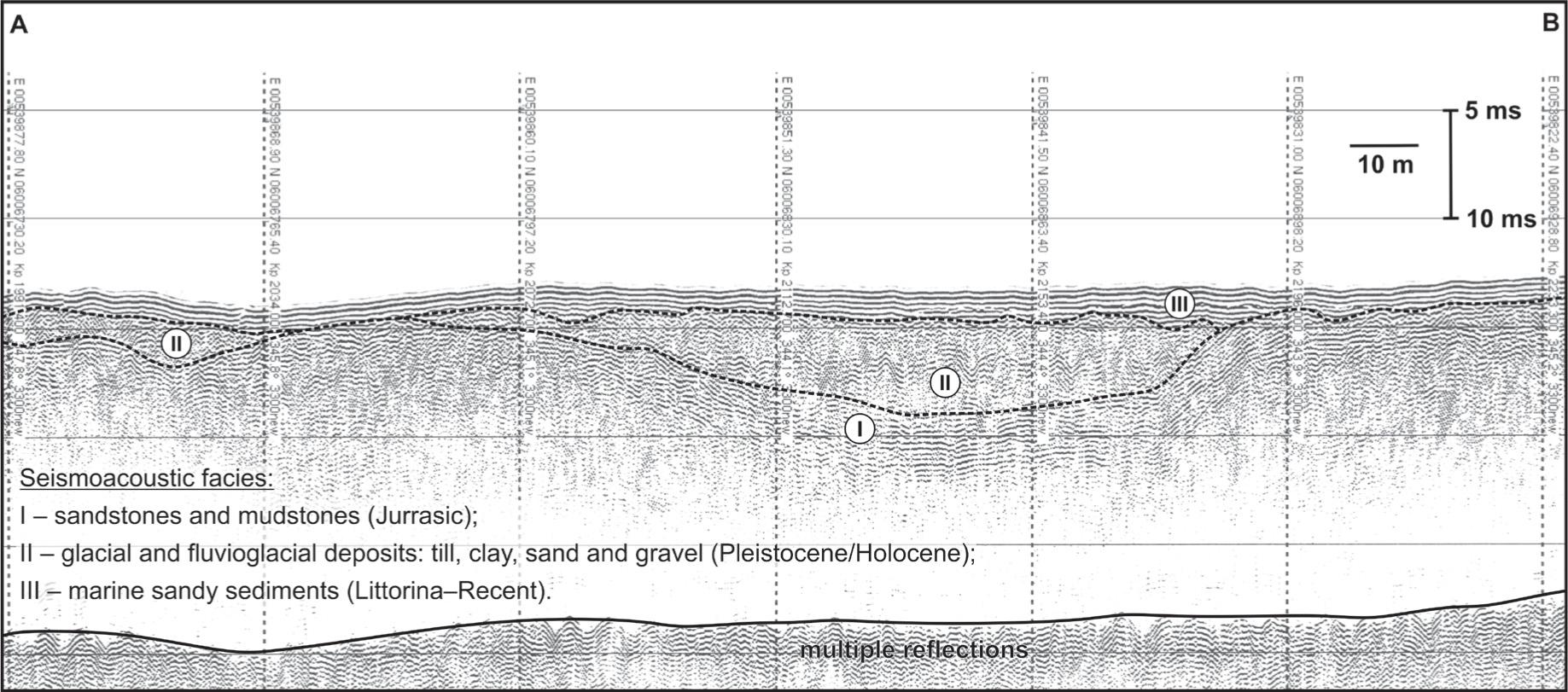The evidence of the distribution of solid rocks in the seabed structure is observed on seismoacoustic profiles (Fig. 8). Considering the previous studies of the geological structure of the region (Dobracka 1987; 1988; Dobracki & Przezdziecki 2007; Kramarska et al. 1999), the rocks were classified as facies of Jurassic sandstones and mudstone. The surface of these rocks is uneven (Fig. 9), eroded and cracked in many places as well as tectonically disrupted. Cuestas, inliers and outliers, rock ridges and furrows can be observed there. Erosional incisions of the upper part of Jurassic rocks are typically filled with the Quaternary terrestrial deposits (Fig. 9), which were classified as facies of glacial and fluvioglacial diamicton, clay, sand and gravel. In many places, the Jurassic rocks build outcrops (see Figs 4, 5, 6 & 9) or they are located on a shallow sub-bottom (less than 1 m below the seafloor) covered by the facies of marine sandy sediments (Figs 8 & 9).