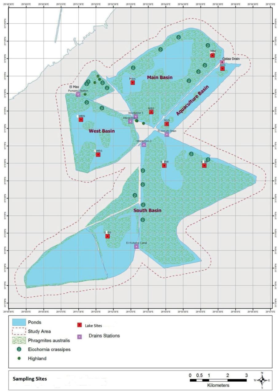 Lake Mariut is a shallow brackish water body with no direct connection to the sea. The lake is located at the longitude of 29º56’E and 29º51’E and the latitude of 31º10’30”N and 31º3’30”N (Fig. 1). The feeding waters of the lake are agricultural waters from El-Umoum Drain, sewage and industrial wastewater from El-Qalaa Drain and fresh water from the Nubaria Canal. The lake is heavily polluted by industrial wastes, in addition to raw and treated sewage from point and nonpoint sources such as agricultural runoff containing fertilizers and pesticides through these drains (Donia 2016). The lake is divided into four basins (Fig. 1): the Main Basin (14.77 km2), the Aquaculture Basin (9.44 km2), the West Basin (11.59 km2) and the South Basin (33.77 km2). The four basins are interconnected with each other by several breaches in the dikes of El-Umoum Drain and the Nubaria Canal. The central portions of the Main Basin receive most of their water from El-Qalaa Drain, in addition to water from El-Umoum Drain via several fractures in its embankment. Lake Mariut surface is maintained at 2.8 m below mean sea level by pumping water from the lake (West Basin) to the sea through El-Max Pumping Station (Khalil et al. 2013). Properties of the water in Lake Mariut are presented in Table 1.