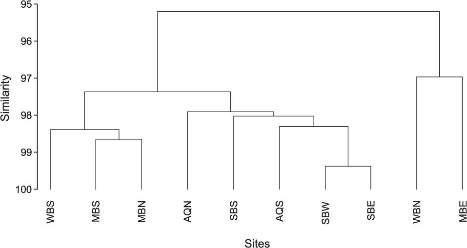 Cluster analysis can be used as an important tool for analyzing heavy metal data to understand the relationship between sampling sites. The cluster diagram shows two clusters (Fig. 2). The first cluster A is formed by WBN and MBE sites with the similarity index of 96.7%, while the cluster B has two subclusters containing the remaining sites with similarity indices ranging from 97.9 to 99.5%. These two clusters are accounted for by the prevalence of different environmental conditions (Rita et al. 2012).