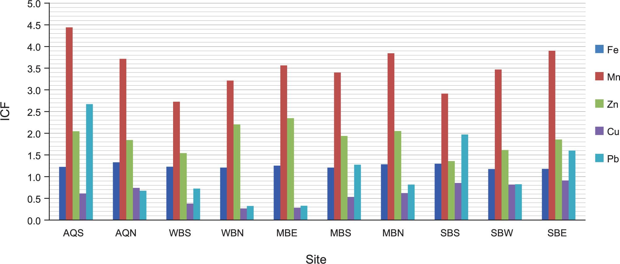 The highest individual contamination factor (ICF) for Mn and Zn (Fig. 3) reflects the risk of contamination of the lake water by metals. The order of average individual contamination factors at the sediment sampling sites was as follow: Mn (3.52) > Zn (1.88) > Fe (1.24) > Pb (1.12) > Cu (0.60).