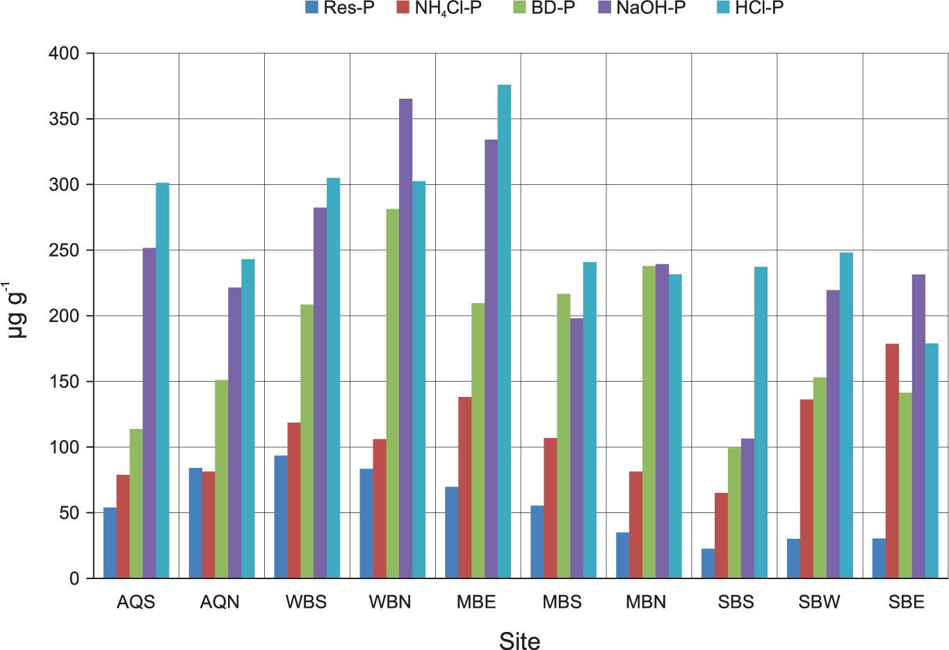 where the South Basin recorded the highest NH4Cl-P percentage (17.7%) and the lowest Res-P percentage (4.0%). No significant differences (P > 0.05) in the content of the sediment P fraction were observed between the studied sites. The distribution of HCl-P, NaOH-P, BD-P, NH4Cl-P in the studied lake was similar to the rank observed in lakes Volvi and Koronia, Greece (Fytianos & Kotzakioti 2005), and totally different from those observed in Egypt for lakes Manzalah (Abdel-Satar & Goher 2009), Qarun and Wadi El-Rayan (Abdel-Satar & Sayed 2010).