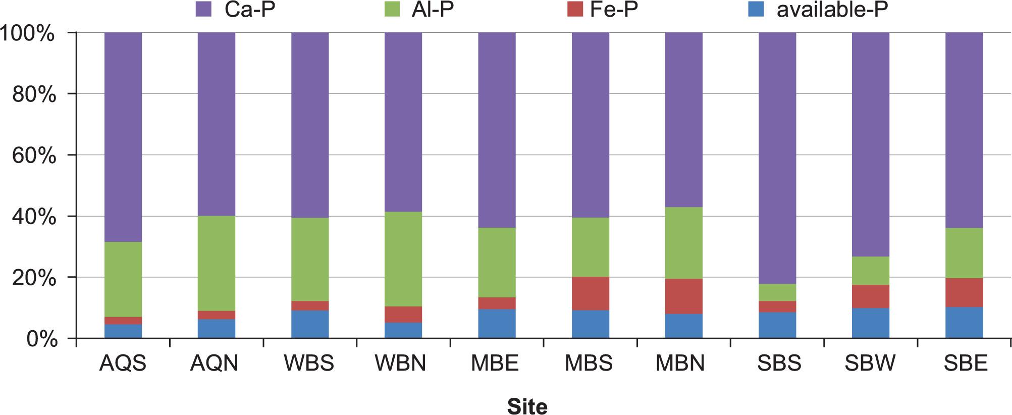 NH4Cl-P content in the sediments was the lowest among the phosphorus fractions, accounting for approximately 13% of the total P. It might be released from calcium carbonate associated P or from decaying cells of bacterial biomass in deposited phytodetrital aggregates (Wang et al. 2013).