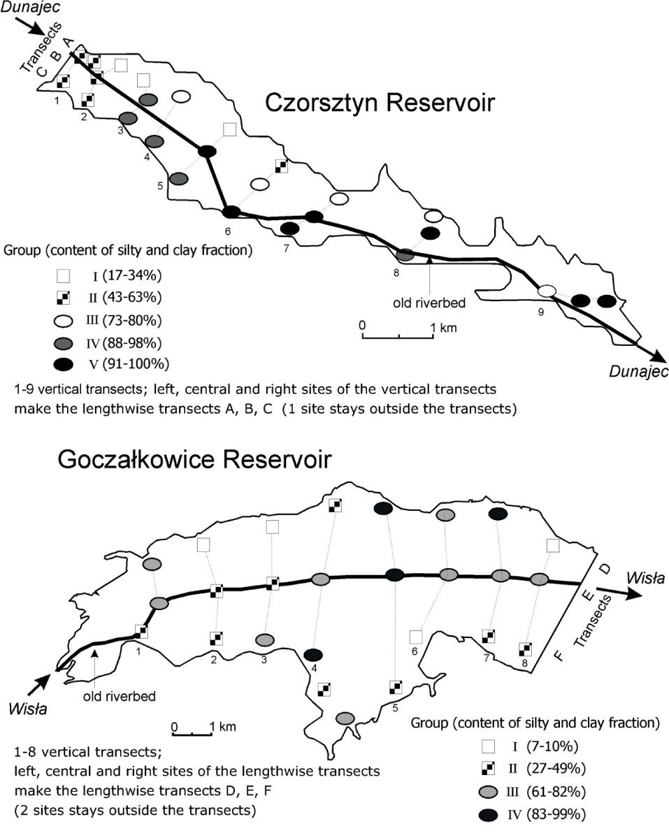 The topography of the deep CR was different from the shallow GR, therefore also high content of silty clay and clay fractions was found in different parts of the reservoirs. Grain size sorting, typical for deep reservoirs, was observed in the central part of the deep intramontane CR (decrease in the sand fraction and increase in the clay fraction from its upper to lower part). The high content of the fine fraction (silty clay and clay) along the right bank could be caused by the old bed of the Dunajec River and carbonate rocks found in this area (Szarek-Gwiazda et al. 2011). A higher content of sand along the left bank of the reservoir could be attributed to at least six small local tributaries that allow their coarser fractions to settle while entering the reservoir.