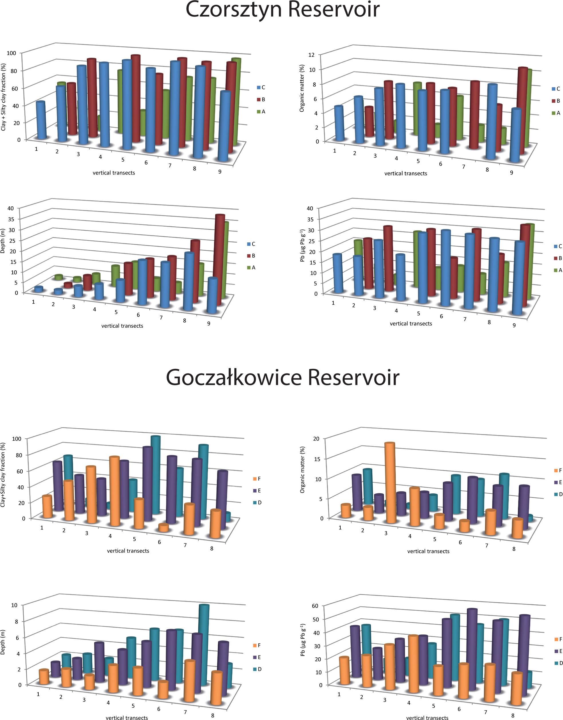 In order to identify factors influencing the accumulation of Pb in sediments of deep and shallow dam reservoirs, the authors: (1) analyzed the distribution of grain size and the content of organic matter and Pb in longitudinal transects of the reservoirs; (2) selected groups of sites that were significantly different from each other in terms of grain size (using hierarchical cluster analysis); (3) analyzed Pb concentrations in the old river bed and beyond; (4) analyzed correlations between the values of environmental parameters and the Pb concentrations.