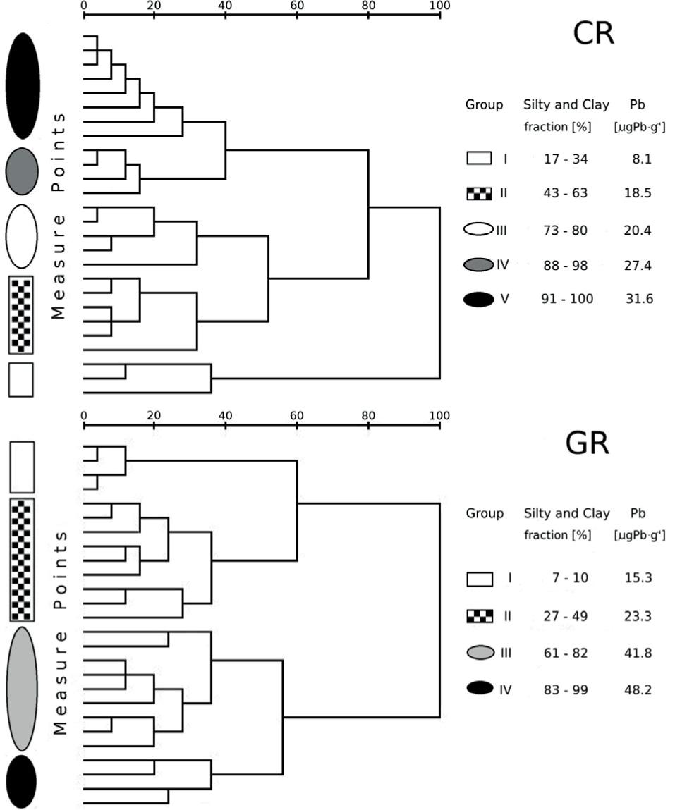 Hierarchical cluster analysis based on sediment granulation in Czorsztyn (CR) and Goczałkowice (GR) Reservoirs. The content of clay and silty clay fractions (range) as well as Pb (mean) in different clusters is given.