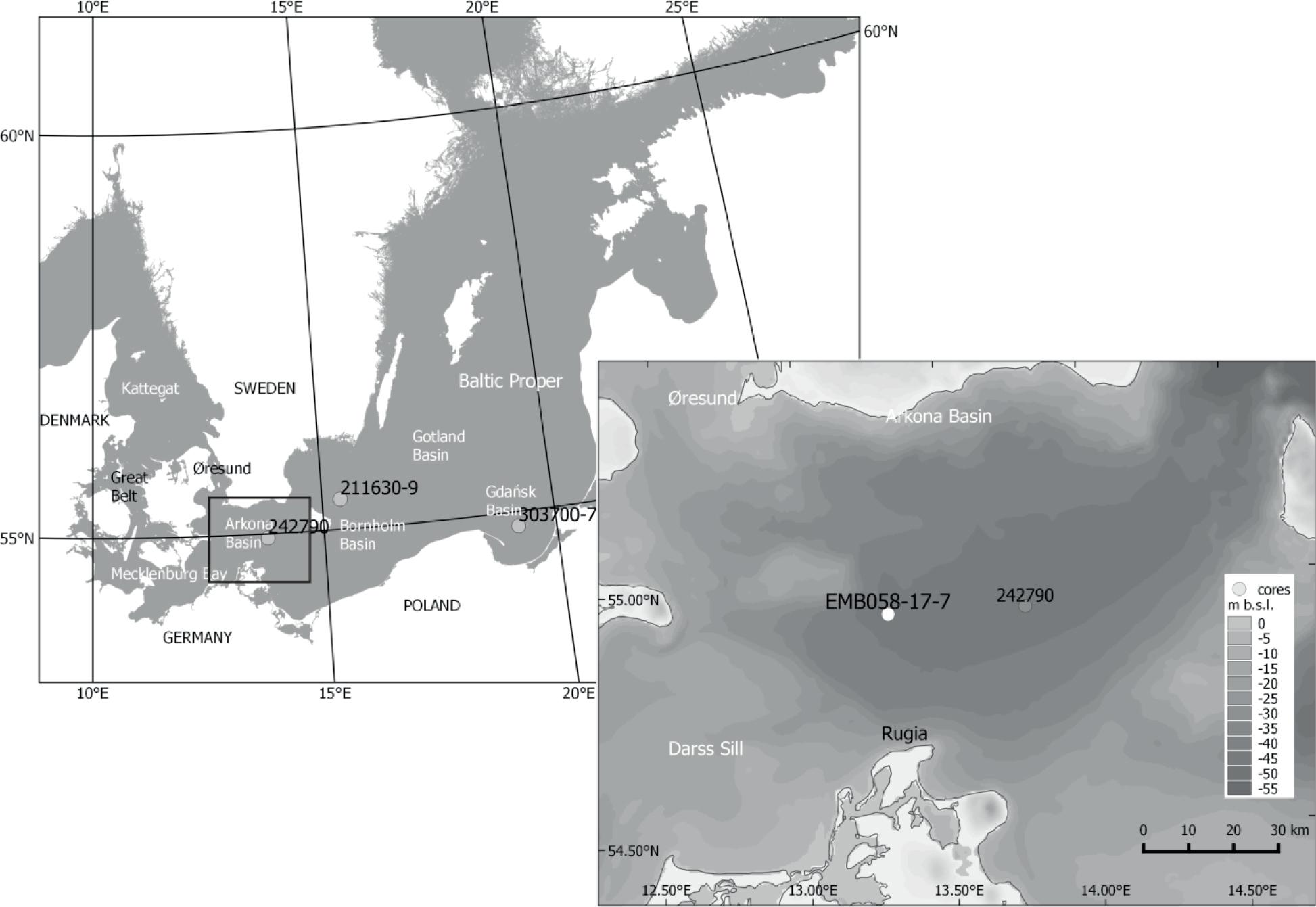 | Bornholm Basin | 55.377°, 15.398° | 211630-9 | 3500-6550 | 228 | 0.48 | Andrén et al. 2000 |