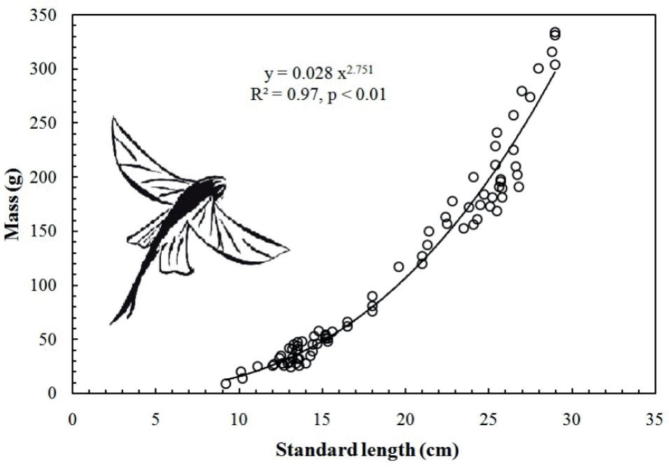 Relationship between mass and body length (standard length) of flying fish samples (n = 82)