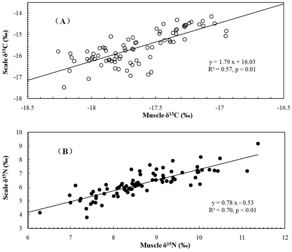 Correlations between flying fish scale and muscle δ13C (A) and δ15N (B)