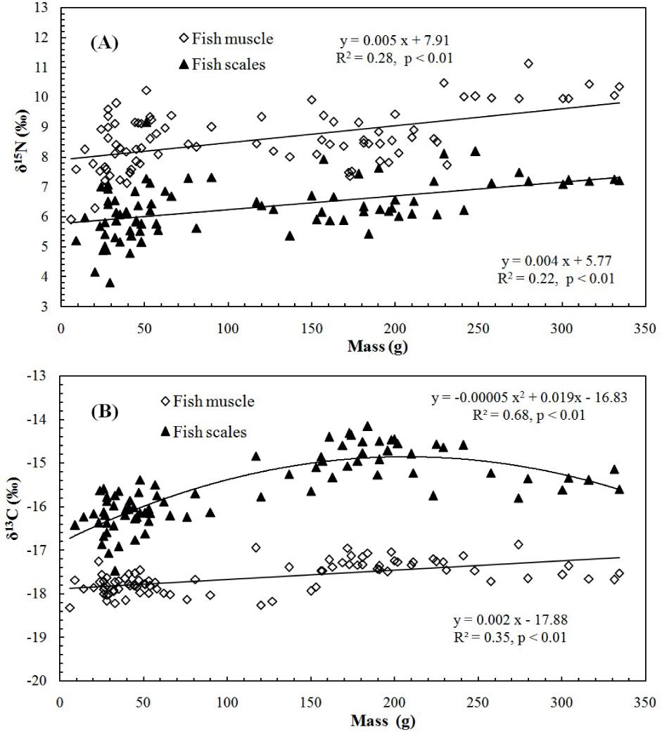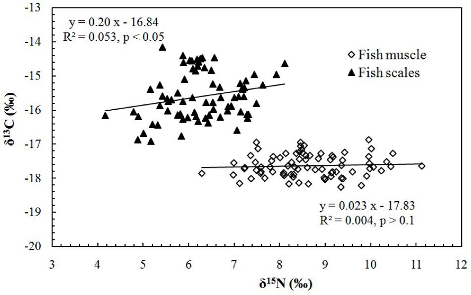 δ15N and δ13C in fish muscle as well as in scales yielded a weak correlation (Fig. 5), suggesting that the fish size, the primary factor affecting δ15N, can impact δ13C to some extent, but is not the most important factor.