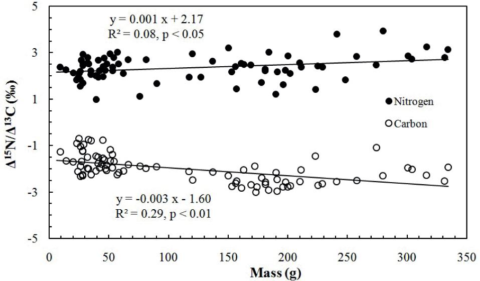 Correlations between nitrogen (solid circle) and carbon (empty circle) isotopic offset between flying fish muscle and scales (Δ15N = δ15Nmuscle − δ15Nscale and Δ13C = δ13Cmuscle − δ13Cscale) with mass