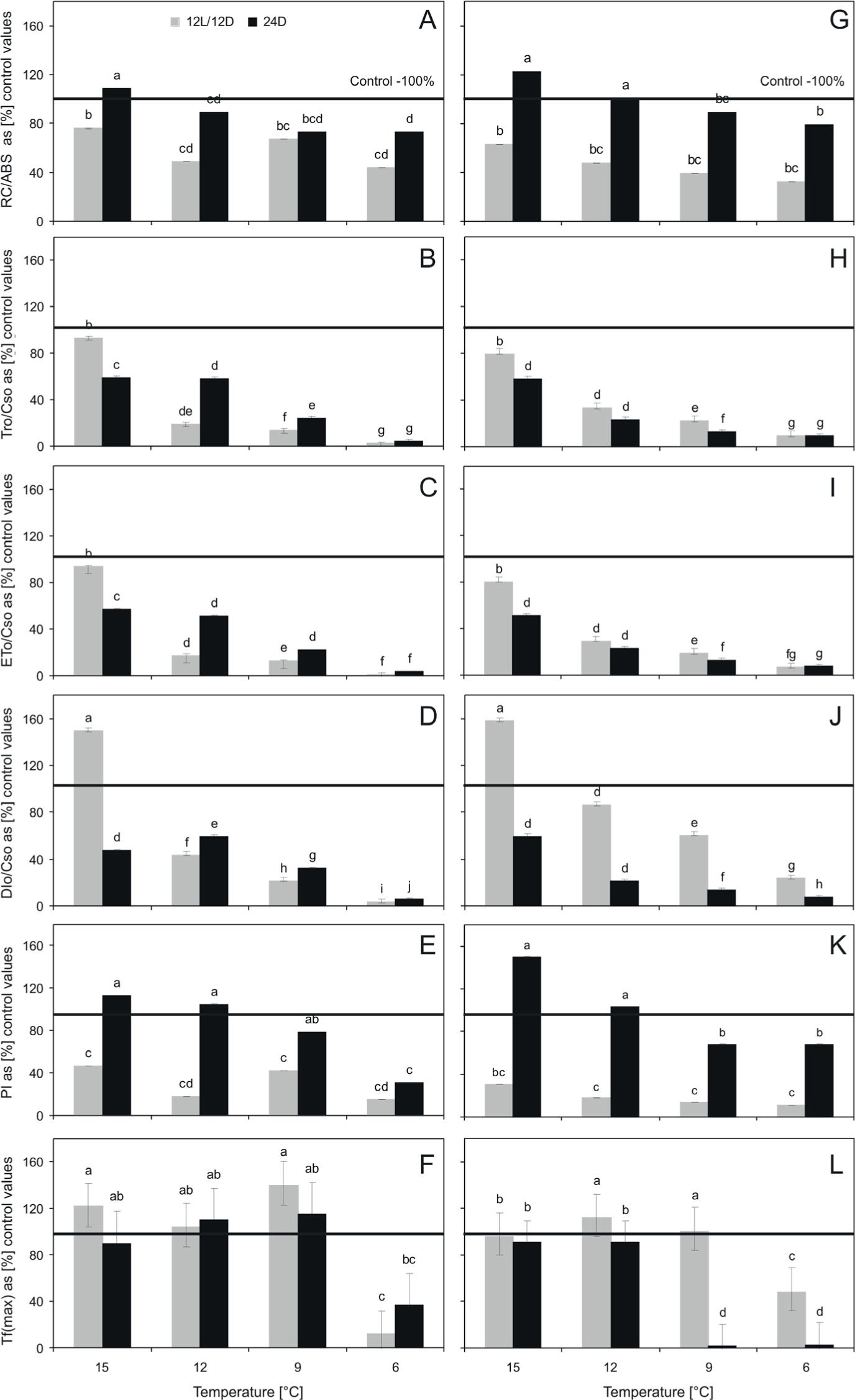 Chlorophyll a fluorescence parameters (expressed as a percentage of control – black axis): RC/ABS – index expression as the density of reaction centers (RC), TRo/CSo – trapped energy flux per cross section (CS) at t = 0, ETo/CSo – electron transport flux per cross section (CS) at t = 0, DIo/CSo – dissipated energy flux per cross section (CS) at t = 0, Tf(max) – time needed to reach Fm (ms), PI – indicator of PSII functioning in two strains Ard7 (A-F) and KD64 (G-L) Paramecium bursaria incubated at temperatures (T): 18, 15, 12, 9, 6°C in the daily cycle of 12 light hours and 12 dark hours (12L/12D), and in constant darkness (24D) conditions. Different letters indicate significant differences according to Duncan’s test (p < 0.05).