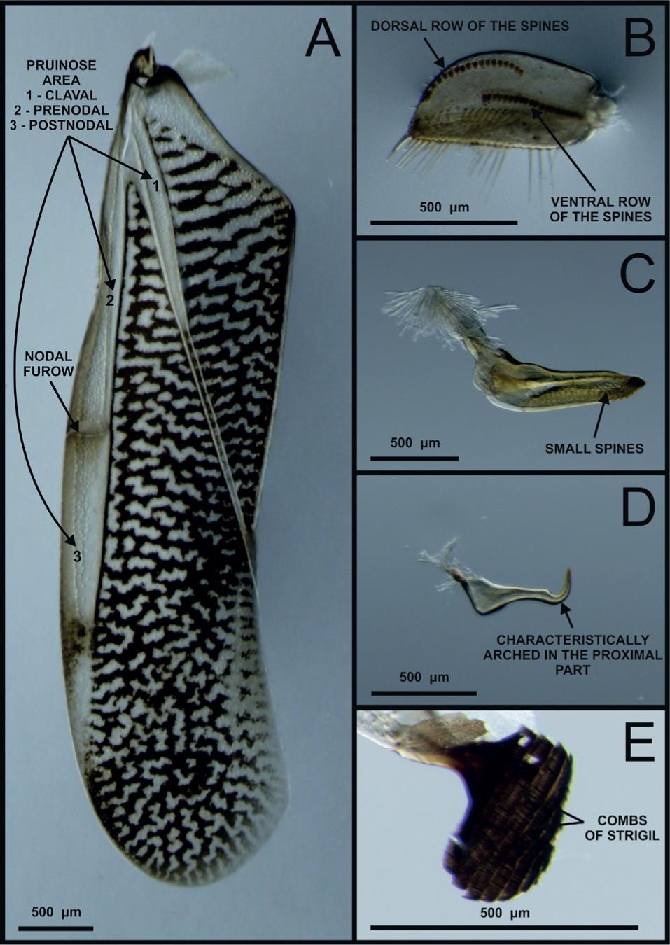 strigil – clearly visible, large and oval with seven shortened combs (Fig. 3E).