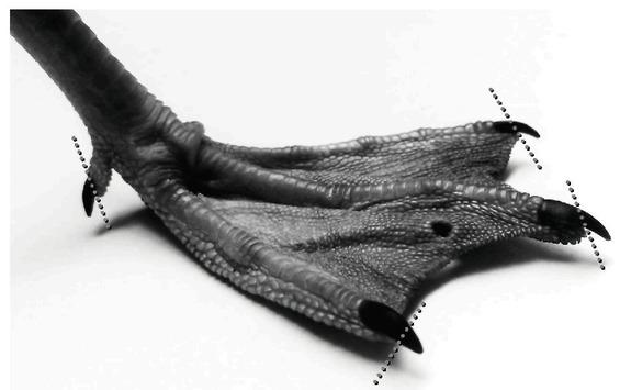 Sampling of herring gull's claws (parts of claws used for the analysis were cut off at the position marked by the dotted line)