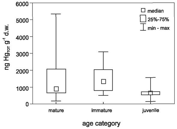 It should be noticed that diet composition remains the most important factor affecting the intraspecific differences in mercury concentrations since food is the main intake path of mercury in seabirds (Scheuhammer et al. 2007). Kojadinovic et al. (2007) indicate that foraging habits may also be related to age. According to this research, mercury levels in adult birds were higher because they may have eaten larger, more contaminated prey compared to younger individuals. Furthermore, although herring gulls are known to be opportunistic predators and scavengers, they also feed on landfills (Meisner et al.