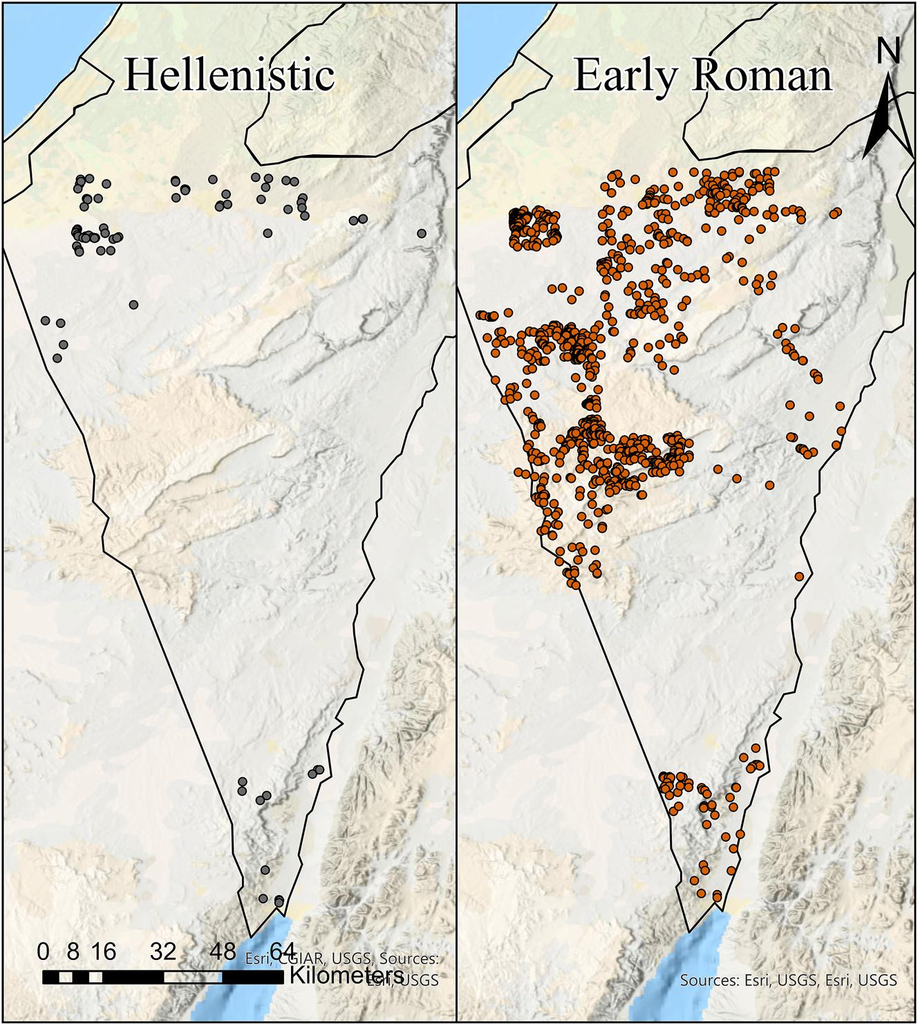 | Increase in number of sites between Hellenistic and Early Roman periods | Increase in number of sites is not actually between the Hellenistic and Roman – increase after 106 CE | High rainfall until 150 CE |