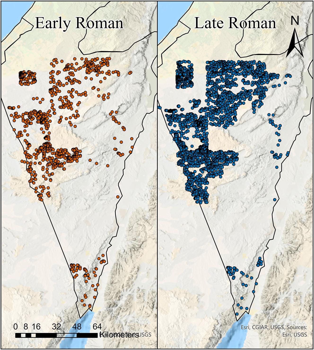 | Large increase in number of sites between Early Roman and Late Roman periods | Continuous increase in number of sites until a peak at the end of the 6th or beginning of the 7th c. CE | Contradicting data – low rainfall but increase in Dead Sea levels from 500 CE |