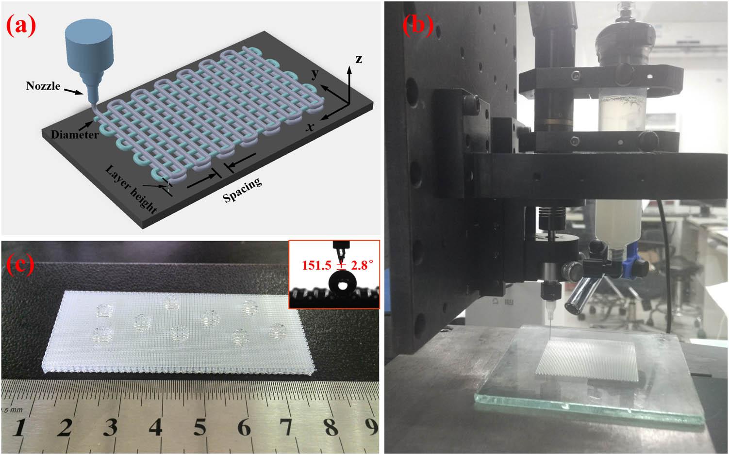 3D printing of porous PDMS with a cross-hatched structure. (a) Schematic representation of the extruded filaments written on the substrates with the tooling path. (b) Fabrication of porous PDMS on the 3D printing platform. (c) PDMS foam sample with superhydrophobicity fabricated by 3D printing. The insert image is the profile of water droplets (5 μL) on the porous PDMS surface, with a WCA of approximately 151.5°.