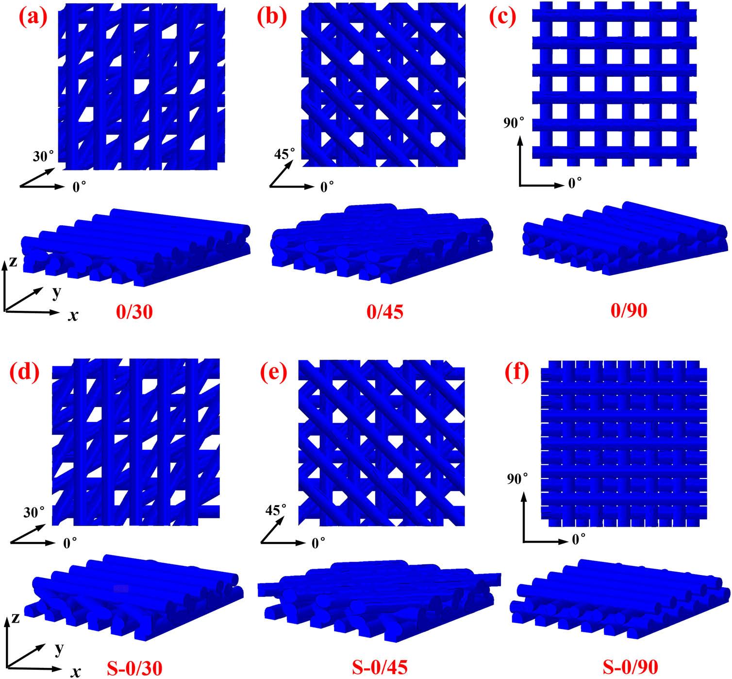 The superhydrophobic properties of the porous PDMS fabricated by 3D printing were primarily related to the filament spacing and diameter of the top layer [53,54]. Therefore, the mechanical properties were regulated by adjusting the lay-down patterns, and the spacing and diameter of the filaments remained unchanged. The architectures were designed by plotting filaments with angle steps of 30°, 45°, and 90° between two sequential layers, denoted 0/30, 0/45, and 0/90 configurations [61], respectively (Figure 2a–c). For the staggered pattern, every other layer was shifted orthogonally to the filament direction by half the spacing relative to the previous, yielding cross-hatched structures, labeled S-0/30, S-0/45, and S-0/90 configurations, respectively (Figure 2d–f). Notably, the pore architecture depended on the filament orientation and layer stagger. For example, a filament deposition angle of 90° created quadrangular pores (Figure 2c and f), whereas angles of 30° or 45° generated polygonal pores (Figure 2a, b, d, and e).