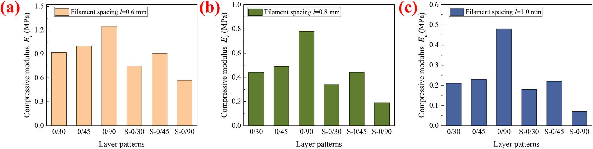 Effect of layered configurations on the E c of porous PDMS fabricated by 3D printing with filament spacings of (a) 0.6, (b) 0.8, and (c) 1.0 mm.