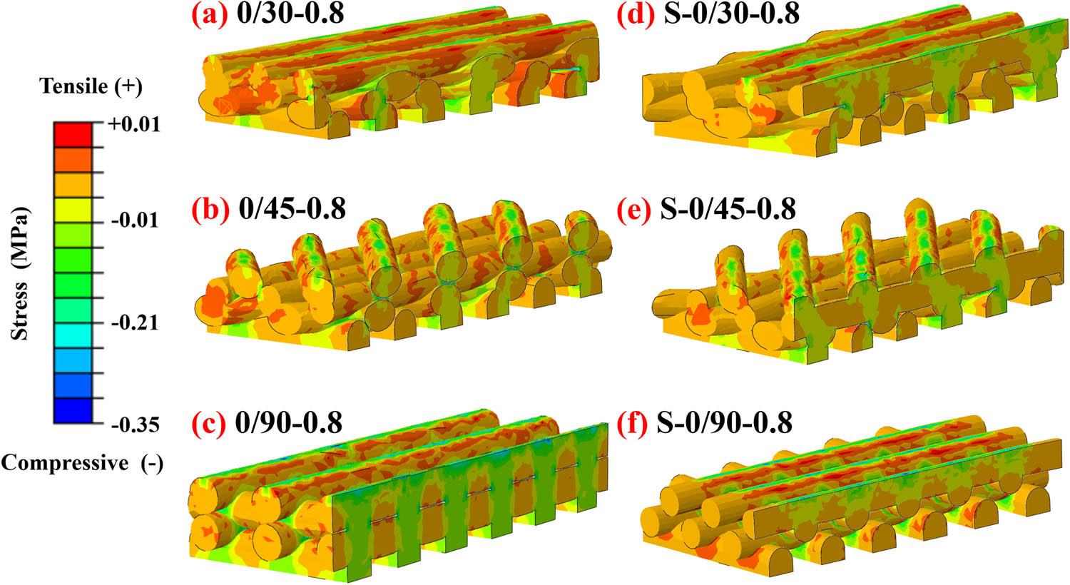 Stress distribution graphs in the x–z section of the models at 10% compressive strain: (a) 0/30-0.8, (b) 0/45-0.8, (c) 0/90-0.8, (d) S-0/30-0.8, (e) S-0/45-0.8, and (f) S-0/90-0.8.