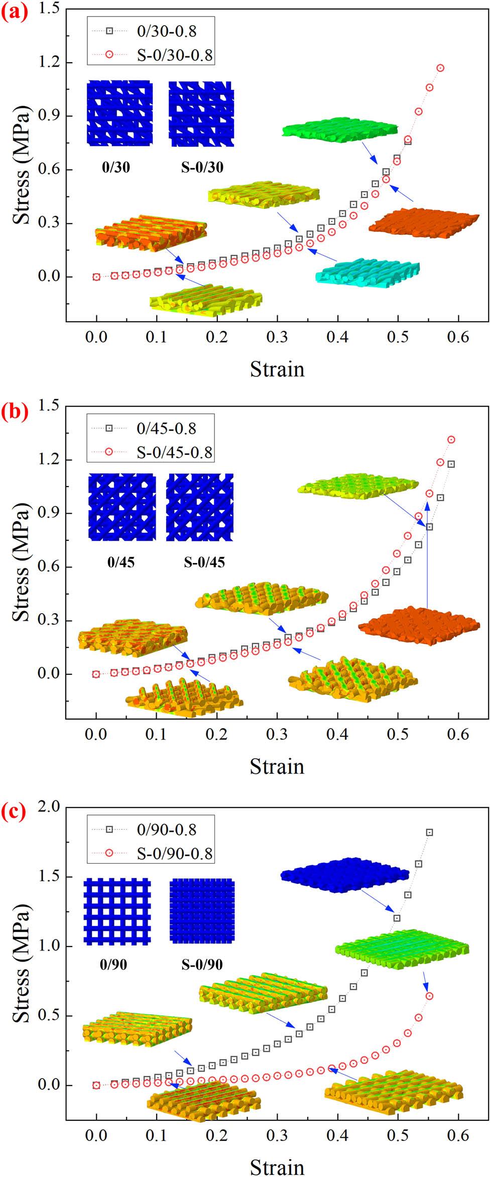 Influence of layered staggering on the compressive behavior of the porous PDMS fabricated by 3D printing with filament raster angles of (a) 0°/30°, (b) 0°/45°, and (c) 0°/90°.