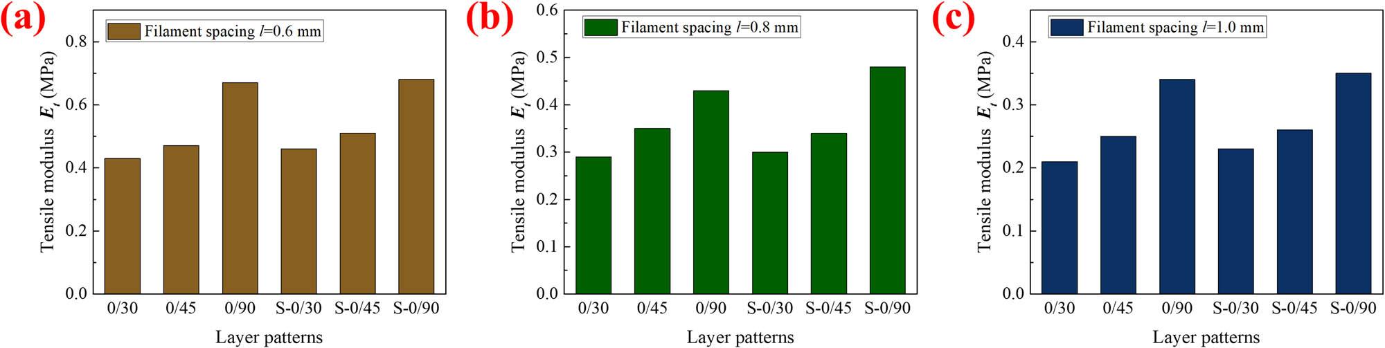 Influence of layer configurations on the E t of the porous PDMS fabricated by 3D printing with filament spacings of (a) 0.6, (b) 0.8, and (c) 1.0 mm.