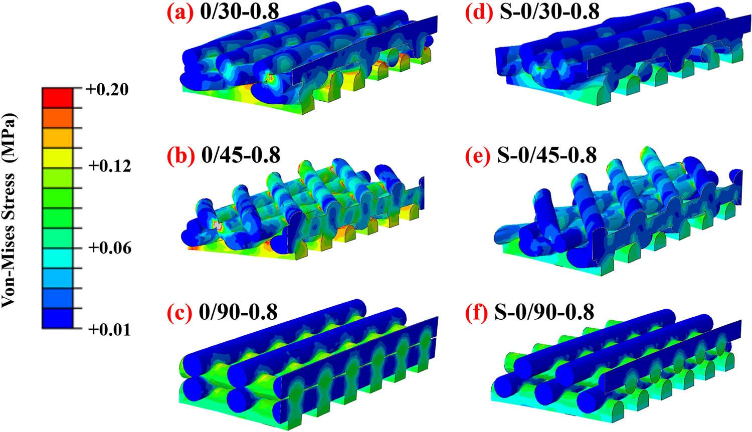 Von-Mises stress distributions of the models in the x–z section at 5% tensile strain in the y-direction: (a) 0/30-0.8, (b) 0/45-0.8, (c) 0/90-0.8, (d) S-0/30-0.8, (e) S-0/45-0.8, and (f) S-0/90-0.8.