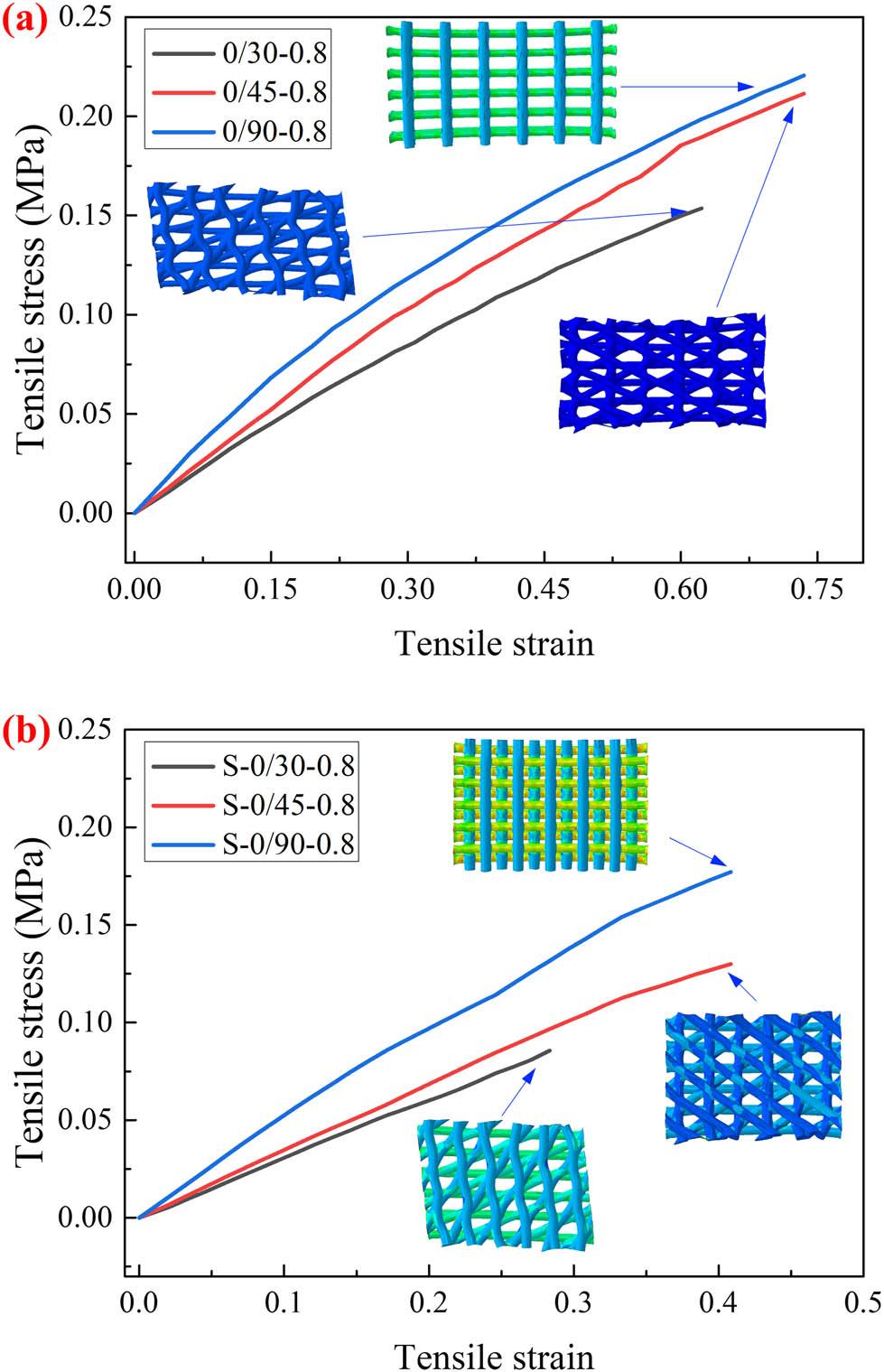Influence of filament orientation on the tension behavior of the porous PDMS fabricated by 3D printing with (a) cross-hatched and (b) staggered structures.