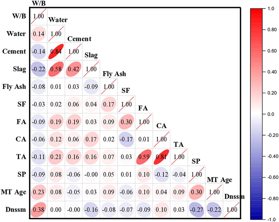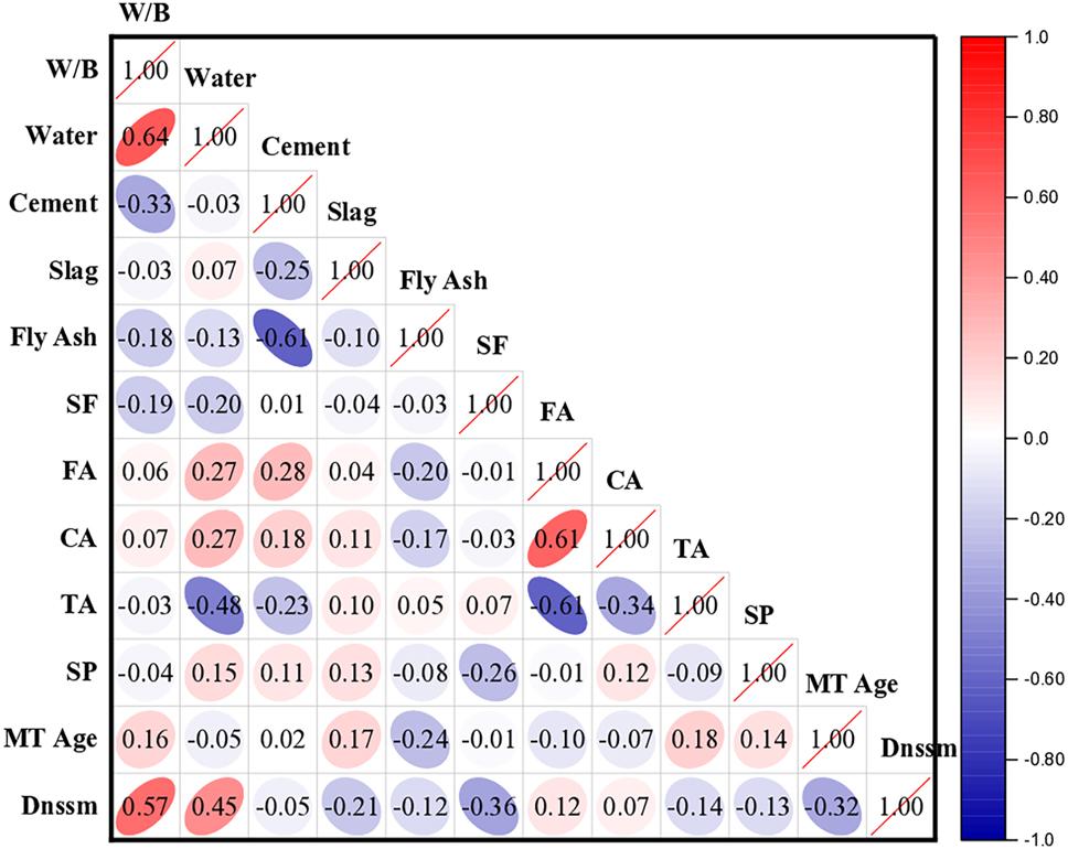 Correlation heatmaps were utilized to evaluate multicollinearity issues. In the Spearman correlation matrix (Figure 5), a notable correlation exists between D nssm and the water-to-binder ratio (W/B), with a coefficient of 0.57. This correlation is followed by water (0.45), fine aggregate (FA, 0.12), and coarse aggregate (CA, 0.07). Additionally, there are negative correlations of −0.36, −0.32, −0.21, −0.14, −0.13, and −0.12 with silica fume (SF), migration test age (MT Age), slag, total aggregate (TA), superplasticizer (SP), and fine aggregate (FA), respectively. Likewise, in the Pearson correlation matrix (Figure 6), W/B exhibits the strongest linear association, with a correlation coefficient of 0.38, followed by CA (0.10) and TA (0.03). Conversely, there are negative correlations of −0.27 and −0.22 with SP and MT Age, respectively. As all features have correlation coefficients below 0.8, multicollinearity is not present.