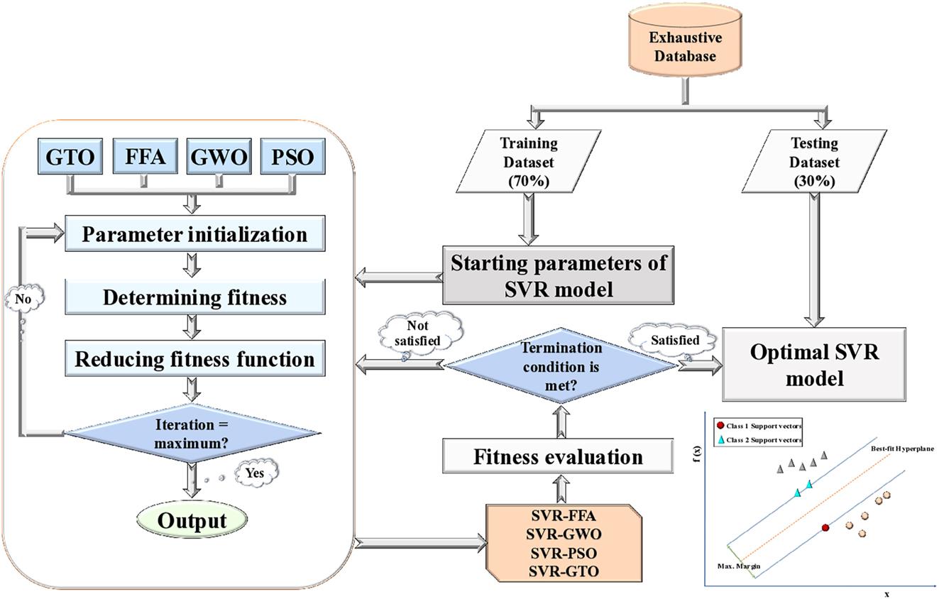 All input features were scaled to have zero mean and unit variance to improve model stability and performance. Correlation analysis using Pearson and Spearman methods confirmed that all variables had correlation coefficients below 0.8, indicating low multicollinearity. The dataset had a high data-to-variable ratio (76.6), exceeding the recommended minimum and reducing the risk of overfitting [45], 46]. Additionally, 30 % of the data was reserved for testing and validation. For the hybrid models, parameter values for the metaheuristic algorithms (GWO, GTO, FFA, and PSO) were initially based on literature. A preliminary sensitivity analysis was also performed to fine-tune the parameters and ensure good optimization performance for the SVR models.
