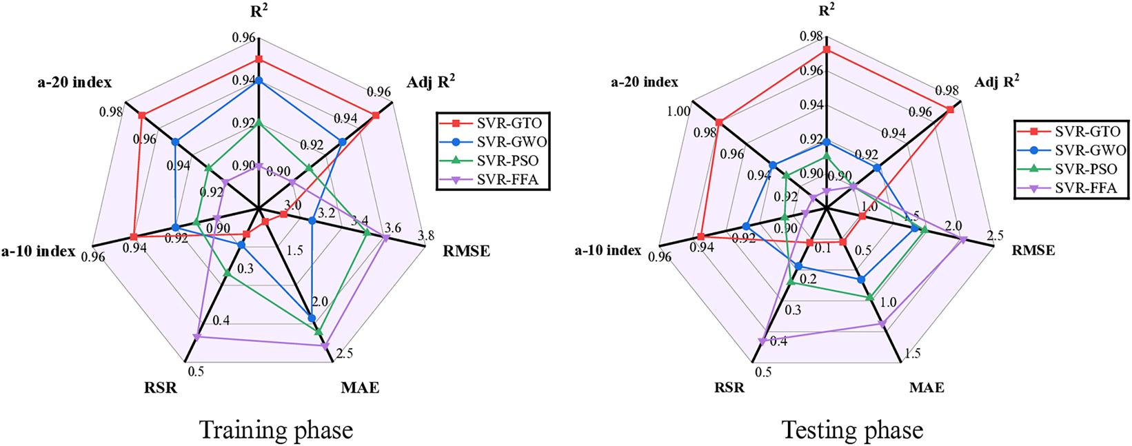 The statistical assessment of the ML models was conducted utilizing key performance indicators for both the training and testing phases (Table 2). In the training phase, SVR-GTO achieved the highest accuracy with an R 2 of 0.95 and an RMSE of 2.95, followed closely by SVR-GWO (R 2 = 0.94, RMSE = 3.12). SVR-PSO and SVR-FFA demonstrated slightly lower performance, with R 2 values of 0.92 and 0.90, and RMSE values of 3.45 and 3.56, respectively.