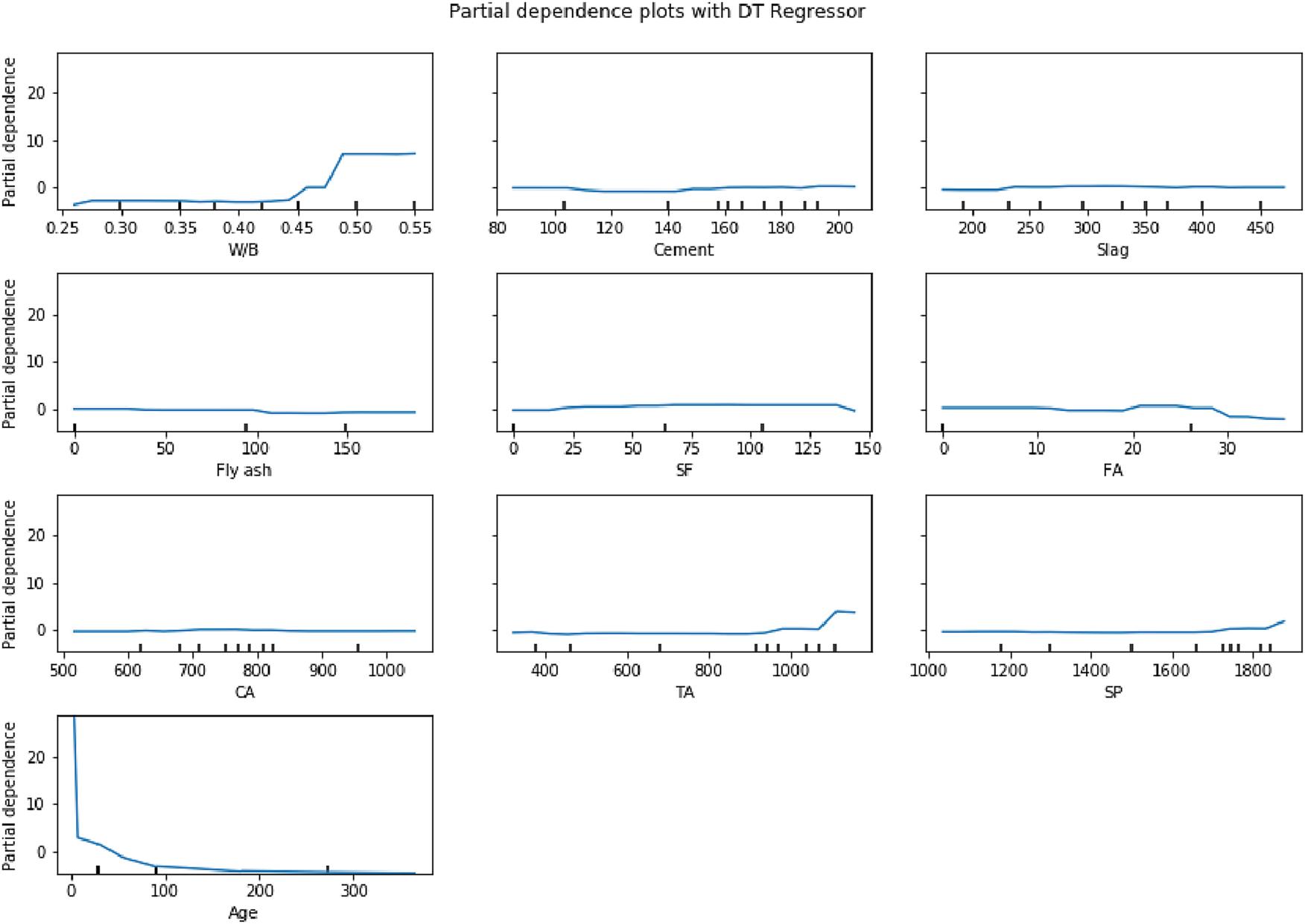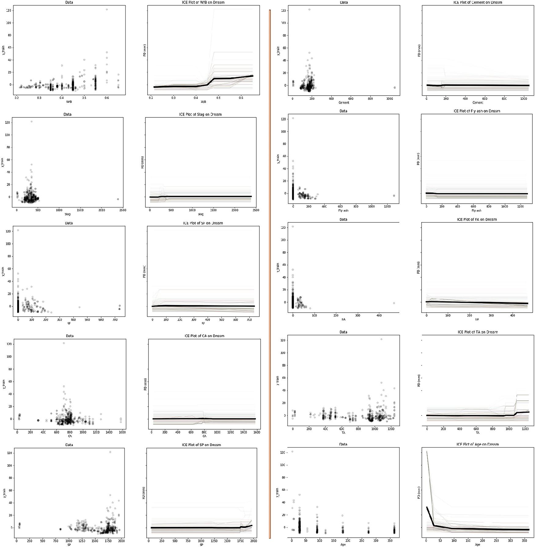 The D nssm of concrete exhibits diverse trends across different material parameters (Figure 15). Initially, D nssm increases with higher W/B ratios but only for a limited range, after which it stabilizes until approximately 0.44. Subsequently, there is a rapid increase in D nssm from 0.44 to 0.49, maintaining a constant value up to 0.55. Similarly, D nssm remains consistent up to 102 kg/m3 of cement, beyond which it experiences a slight decrease until approximately 145 kg/m3, remaining relatively constant thereafter. Additionally, D nssm remains constant up to 225 kg/m3 and then slightly decreases. Furthermore, D nssm shows a slight decrease up to 90 kg/m3, followed by a more significant decrease up to 100 kg/m3, after which it remains constant. D nssm almost remains constant with an increase in SF but decreases around 112 kg/m3. It also decreases slightly up to 18 kg/m3of FA, then shows a slight rise and decreases again. With an increase in CA content, D nssm remains almost constant and slightly decreases initially but remains constant up to 980 kg/m3, after which it increases. Moreover, D nssm initially experiences a rapid fall with a rise in MT age and continues to decrease with further increases in MT age. The PDP analysis reveals that D nssm rises sharply when the TA content exceeds approximately 1,100 kg/m3, consistent with the SHAP findings.