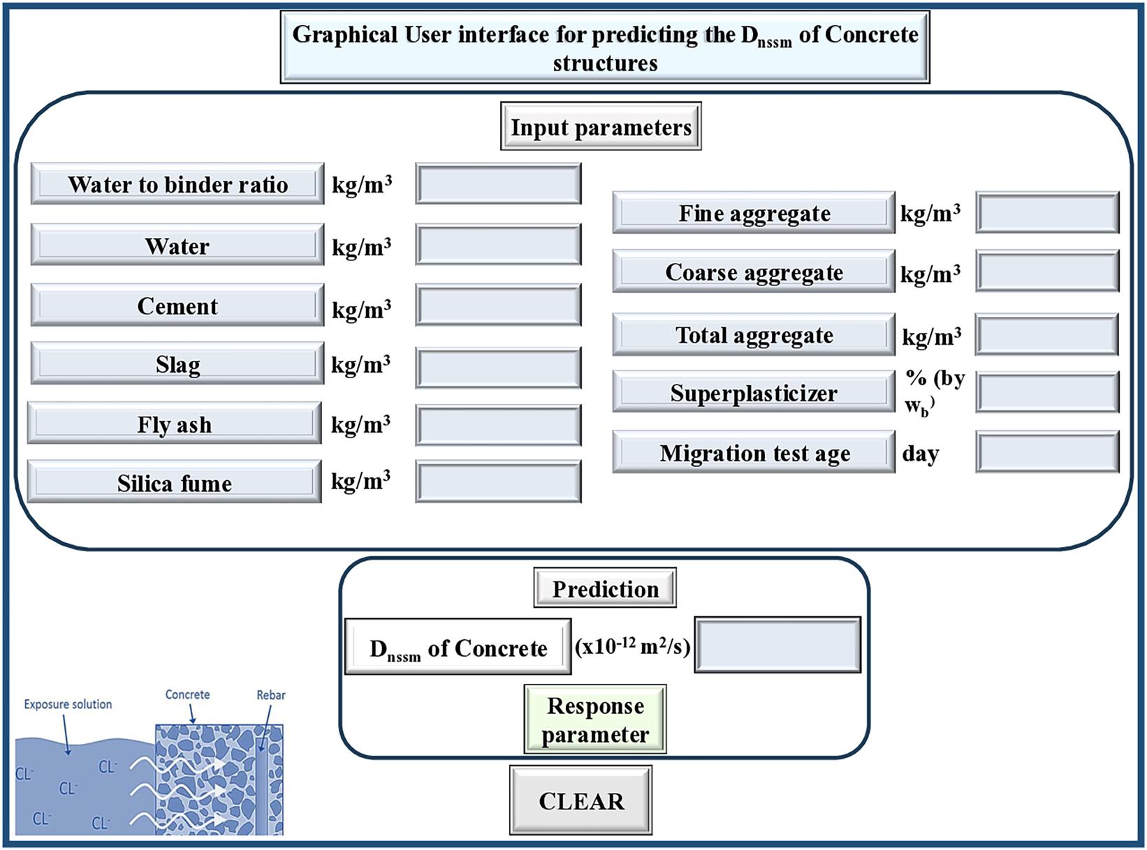 An interactive GUI, depicted in Figure 17, was designed to streamline the prediction of the D nssm of concrete. This innovative tool eliminates reliance on traditional labor-intensive laboratory testing, enabling rapid and accurate assessment of chloride penetration resistance. By inputting key parameters, users can efficiently obtain precise predictions of the migration coefficient, a critical indicator of concrete durability in chloride-exposed environments. The GUI, driven by advanced ML models, provides a practical and easy-to-use tool for researchers and professionals to assess the durability of concrete structures. This interface represents a significant step forward in forecasting chloride resistance, supporting the development of long-lasting, resilient infrastructure in chloride-rich conditions (Figure 17).