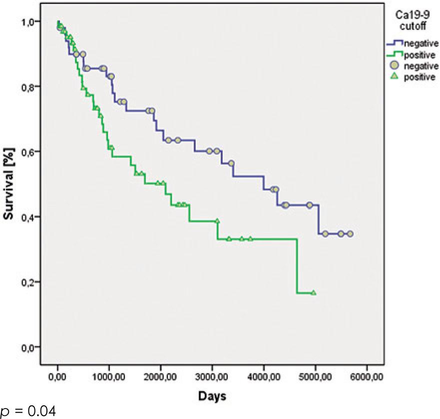 According to previous reports, micrometastases in the lymph nodes have significant impact on patient survival.5,22-24 As the incidence of micrometastases is said to be even as high as 30% in node-negative patients25-27, it appears that these patients should be correctly staged at least intraoperatively. While it might be possible to reliably detect micrometastases with immunohistochemical or molecular techniques6-9, these techniques are time and labour intensive, and the results are usually available only after the operation. To identify a preoperative tool for micrometastases prediction, we explored the prognostic value of CA19-9 serum levels in node-negative patients.