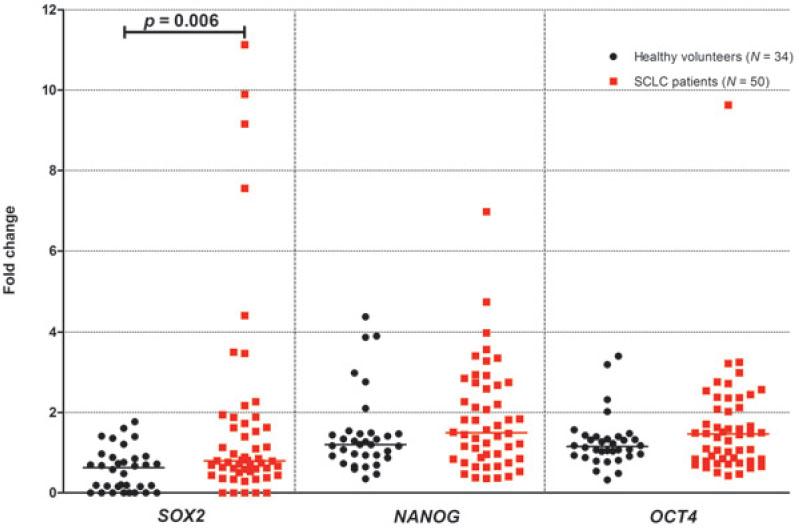 SOX2, NANOG and OCT4 mRNA expression levels in whole blood of healthy volunteers and small-cell lung cancer (SCLC) patients.