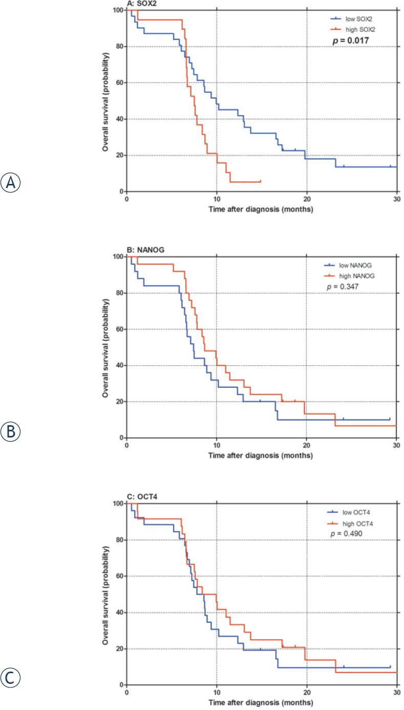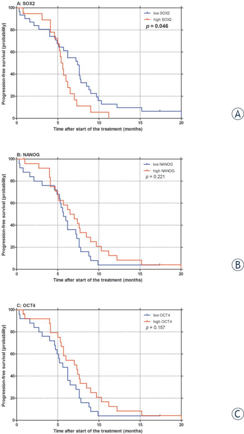 The level of SOX2 mRNA expression, significantly influenced both PFS after first-line chemotherapy (p = 0.046; Table 3, Figure 2A) and OS (p = 0.017; Table 3, Figure 3A) in our patients, with high SOX2 being associated with poor PFS and OS. Furthermore, in multivariate analysis independent prognostic value of SOX2 expression was confirmed for OS (p = 0.002; Table 3). On the other hand, no significant correlation between NANOG or OCT4 expression and survival outcomes was observed in univariate (Table 3, Figures 2-3) or multivariate analysis (Table 3).