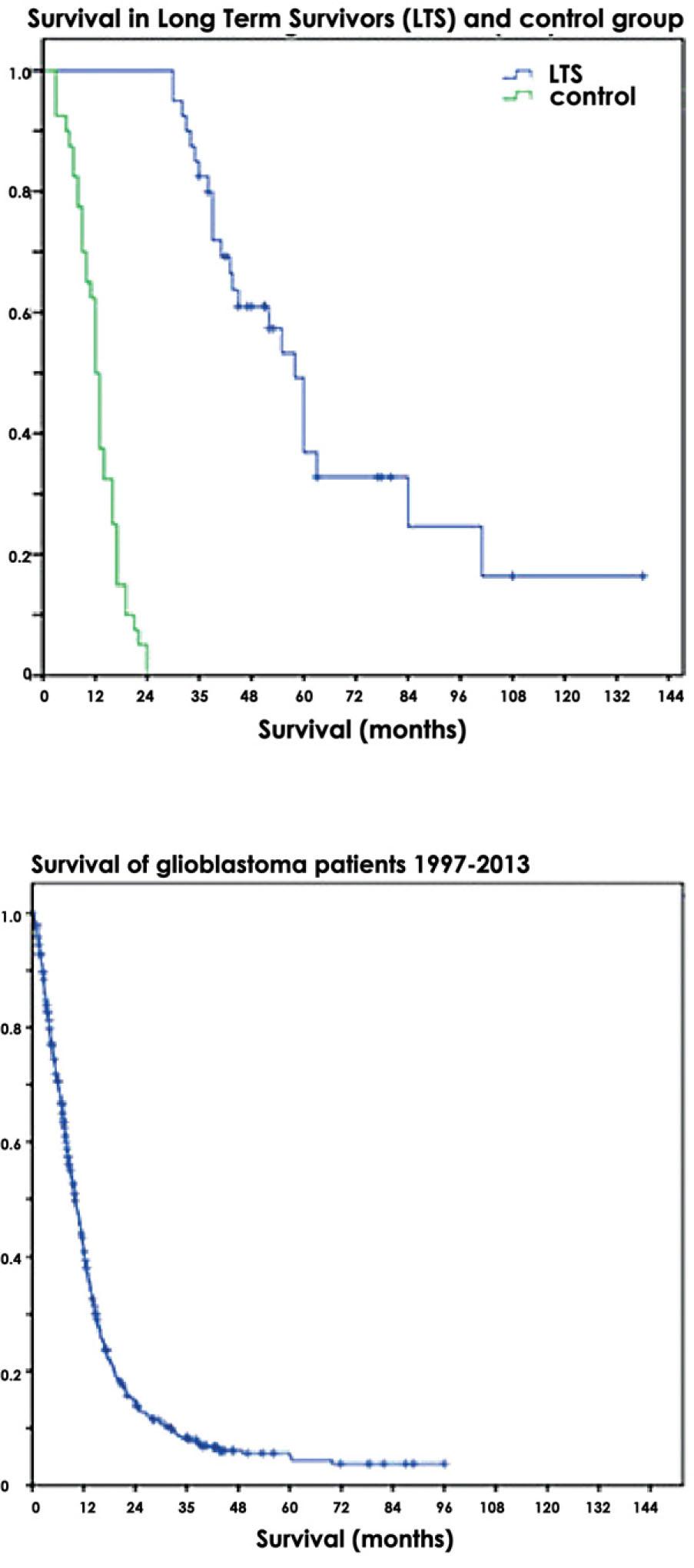 Treatment with surgery, conformal radiotherapy and chemotherapy led to modest improvement in the prognosis of patients with glioblastoma (GBM). In the past, surgery alone or combined with less precise techniques of radiotherapy led to median survival of 12 months and only about 20% of patients survived beyond 2 years.1,2 After introduction of modern tri-modality treatment, median survival extended to 14 months.3,4 For the majority of patients, however, the prognosis remains poor and long-term survival beyond 3 years after diagnosis is still rare.5