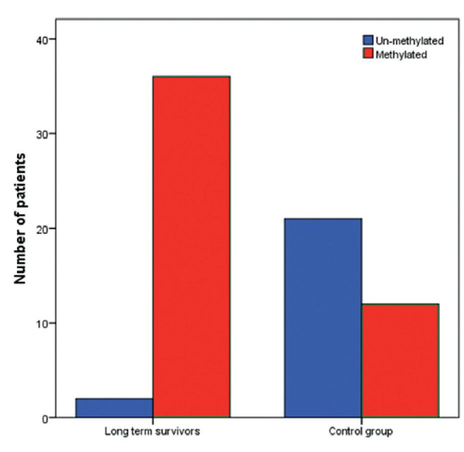 Methyl guanine methyl transferase (MGMT) promoter methylation in long term survivors and control group.