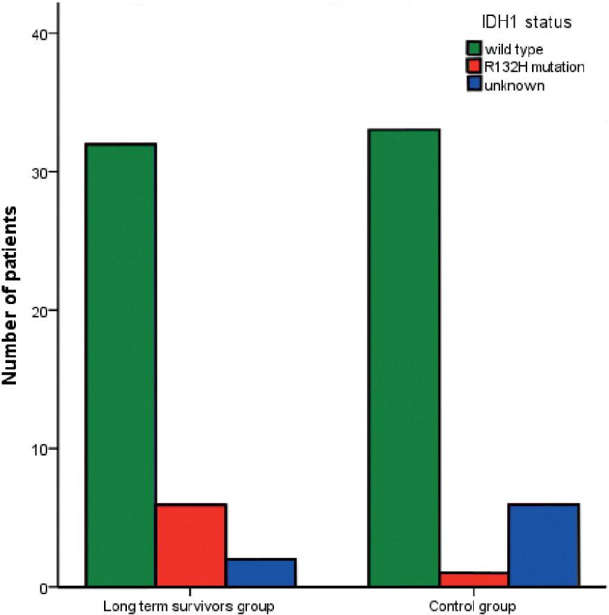 Izocitratedehidrogenaze1 (IDH1) mutations in long term survivors and control group.